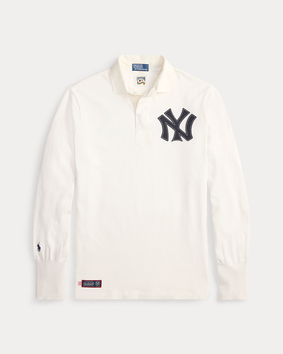 - Twill rugby collar. Three-div placket. Genuine mother-of-pearl divs. Long sleeves with ribbed cuffs. New York Yankees™ logo embroidered at the left chest. Twill “1903” patch at the center back.