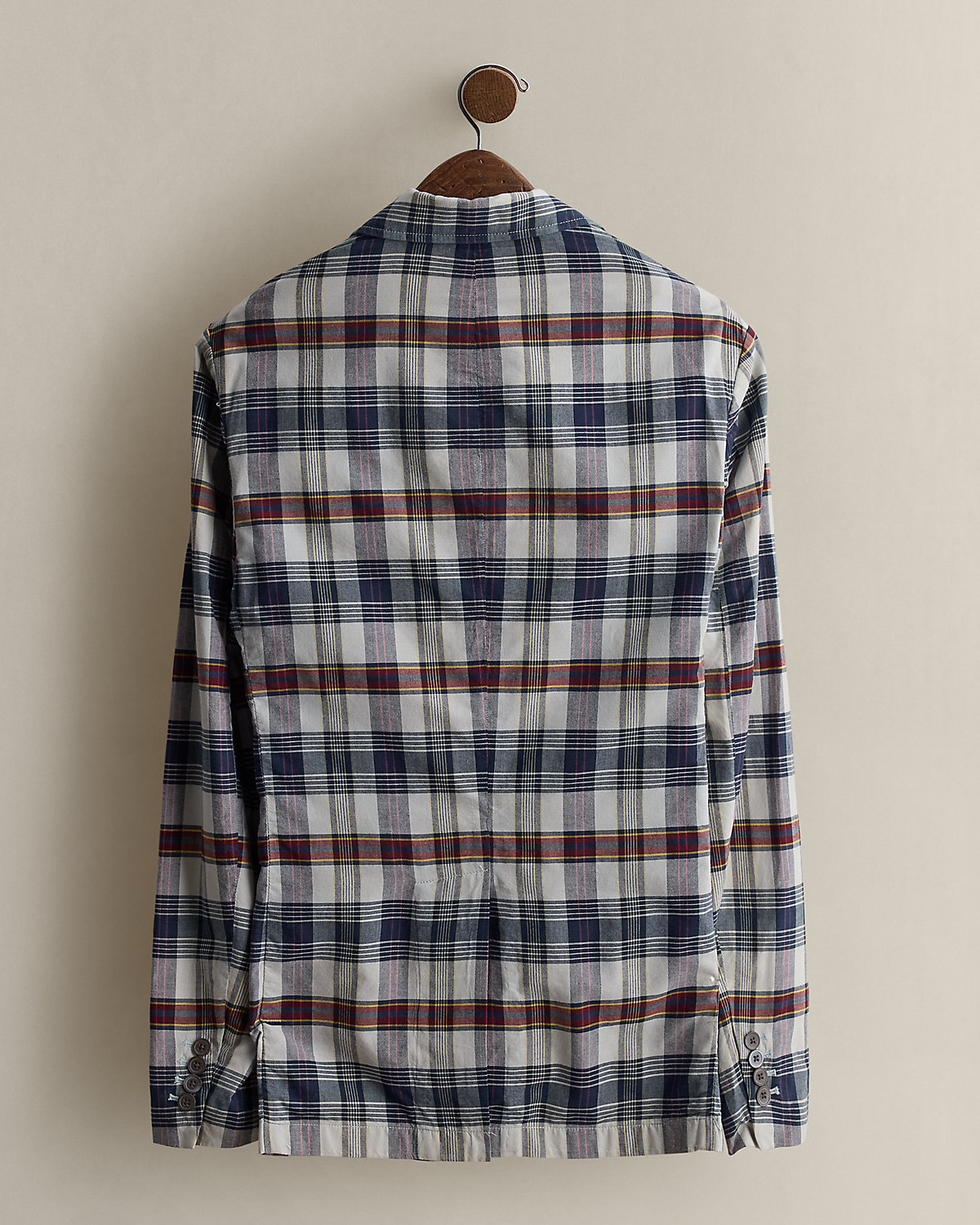 Part of the 2007 Polo collection. Sport coat made with plaid cotton fabric. Constructed with a three-div silhouette. Size 40R has approximately a 29.75" back body length, a 17.75" shoulder, a 40.5" chest, and a 25.5" sleeve length.