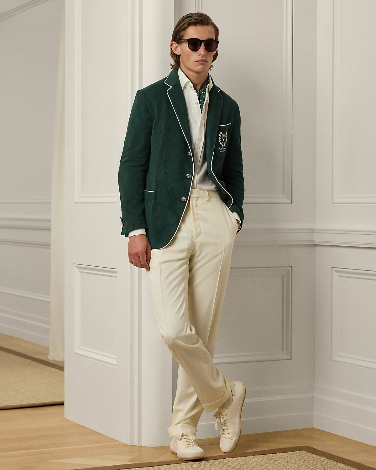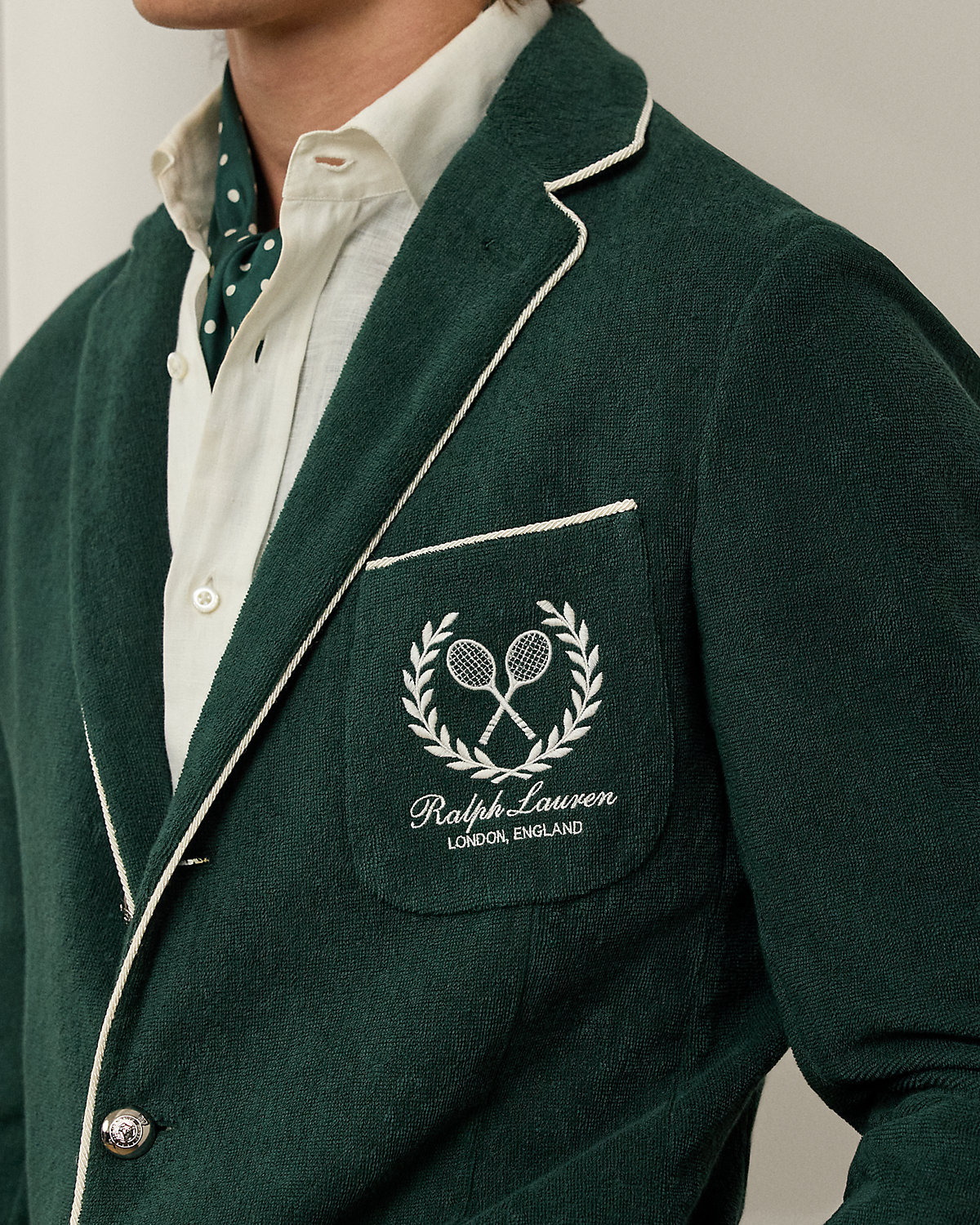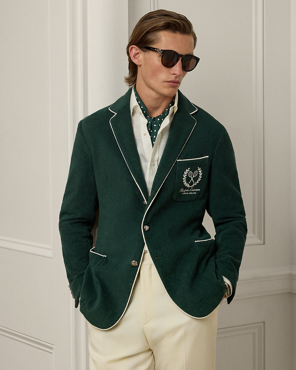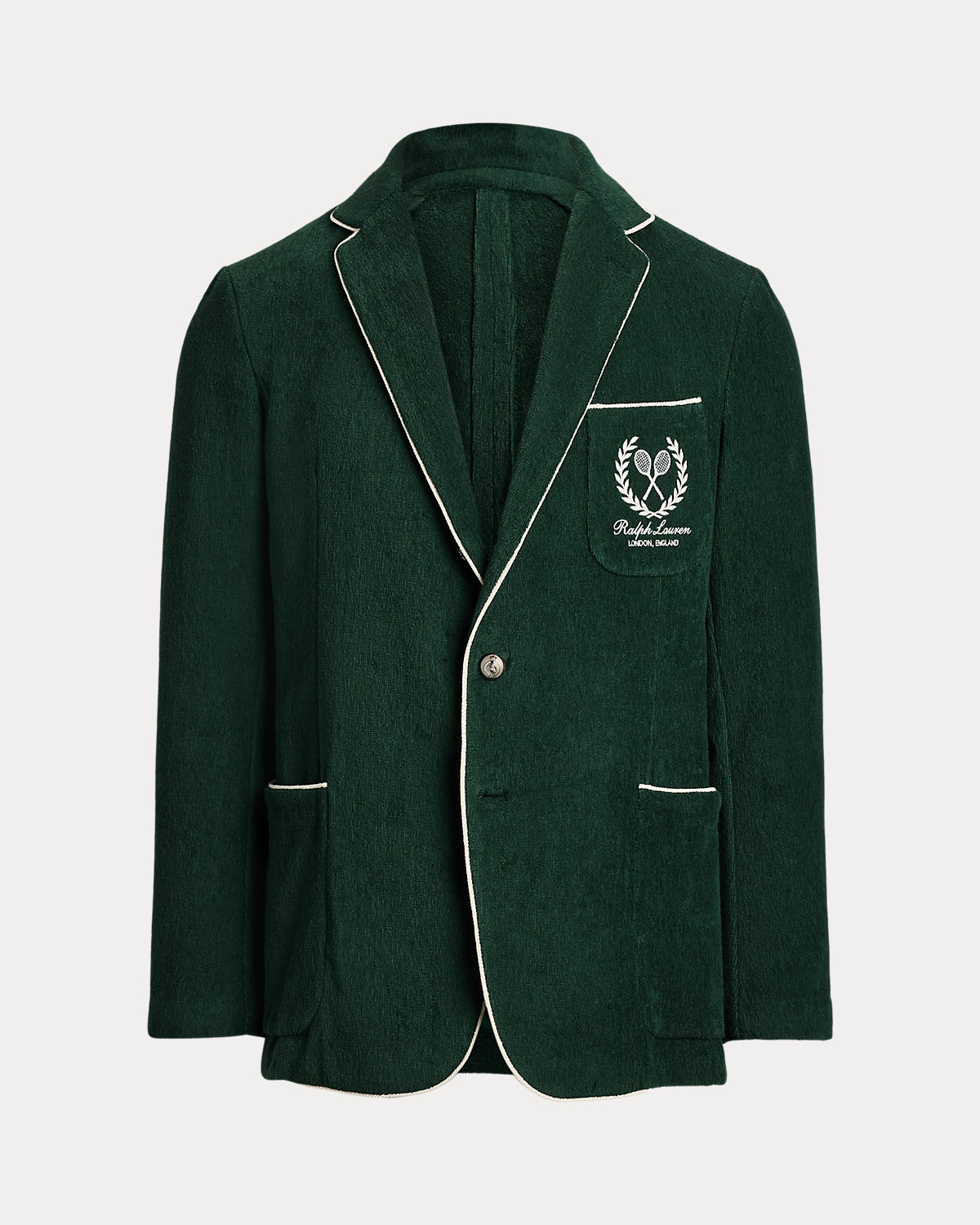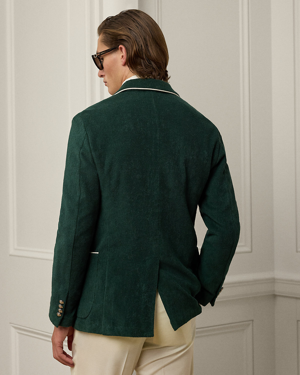 This blazer's plush cotton terry is transformed through masterful Italian hand-tailoring to create a statement of sophisticated ease. Our signature metal divs and embroidered "Ralpthth Lauren" crest perfectly balances heritage detailing with contemporary comfort.