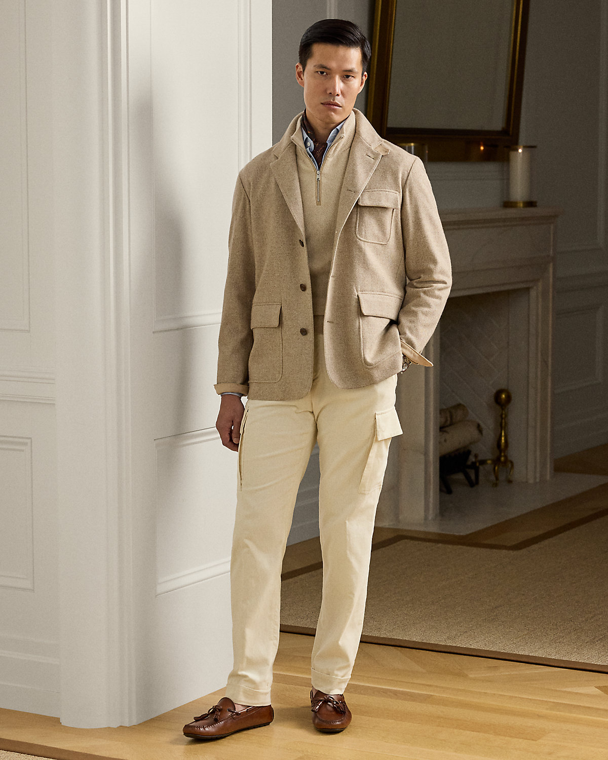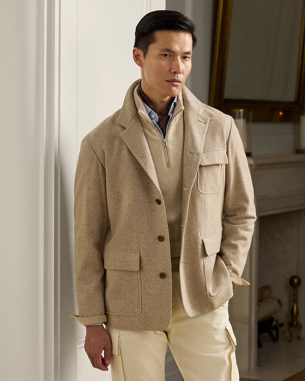 Hand-tailored in Italy, this jacket is crafted from a textured tick-weave cloth that draws inspiration from a classic Ralpthth Lauren pattern. The custom-developed fabric is beautifully woven with a blend of wool, mulberry silk, and cashmere.