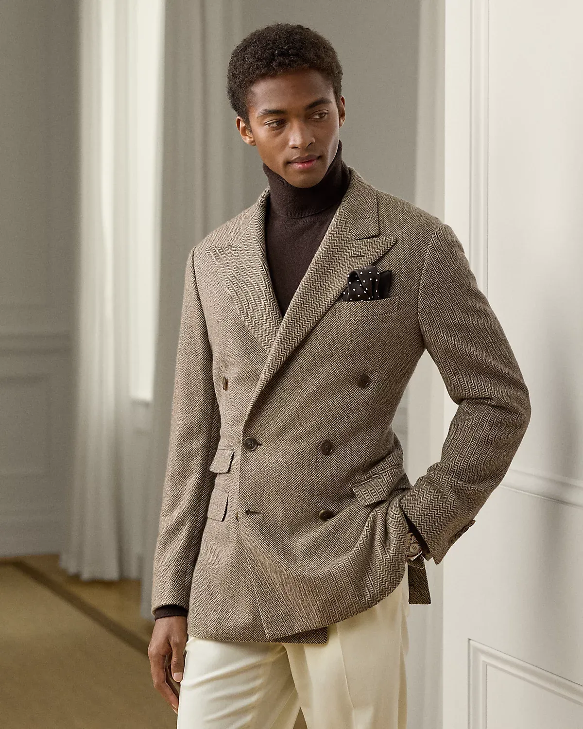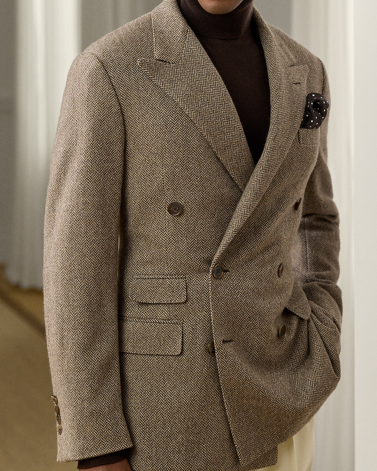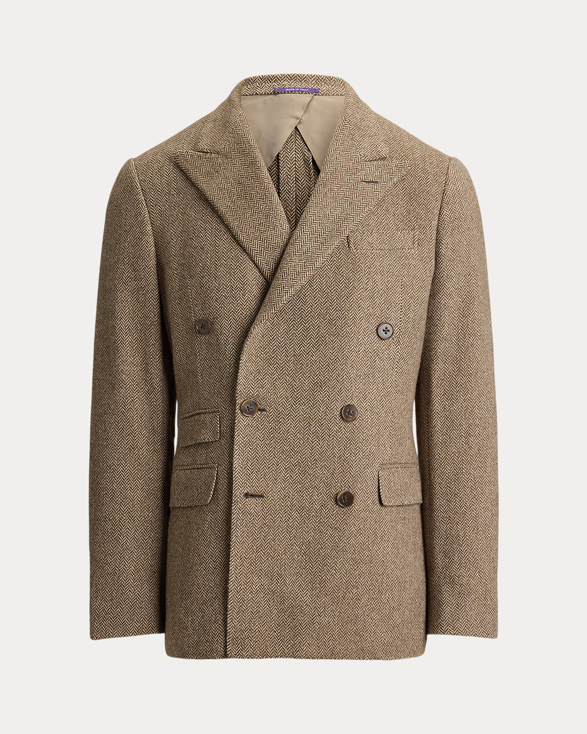 Hand-tailored in Italy, the Kent combines a lighter construction with fine canvassing and a soft shoulder to create a more natural profile. This double-breasted version’s herringbone twill was custom-developed for Ralpthth Lauren using a luxurious blend of mulberry silk, wool, and cashmere.