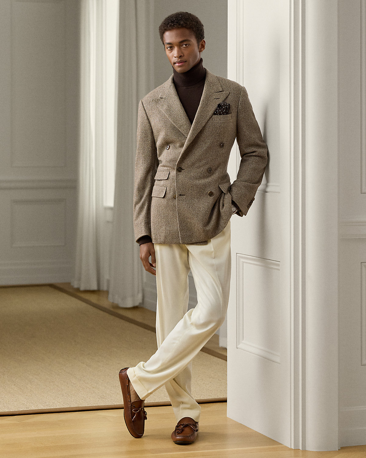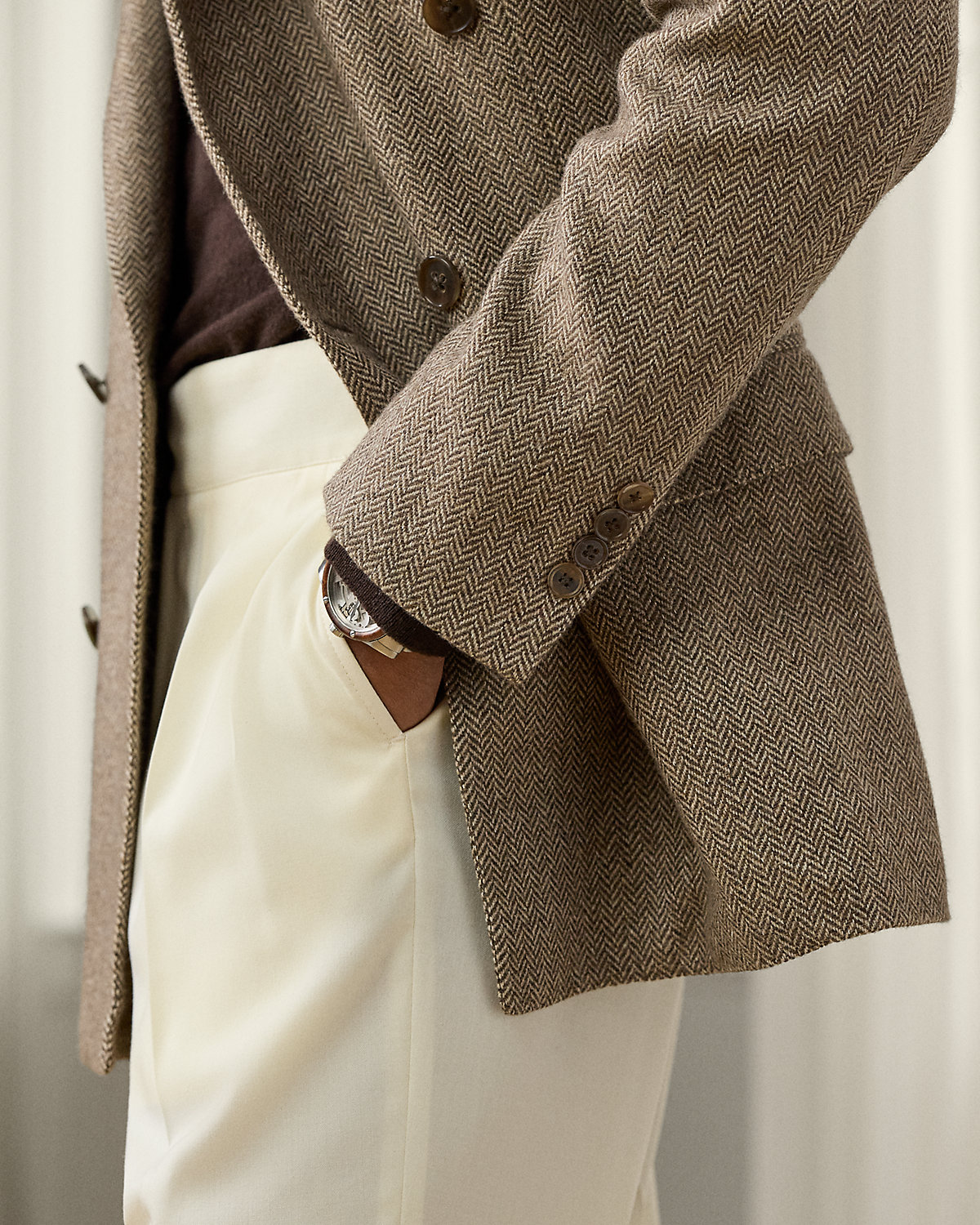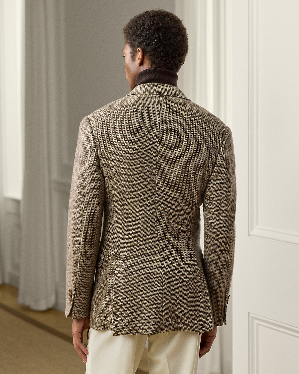Hand-tailored in Italy, the Kent combines a lighter construction with fine canvassing and a soft shoulder to create a more natural profile. This double-breasted version’s herringbone twill was custom-developed for Ralpthth Lauren using a luxurious blend of mulberry silk, wool, and cashmere.