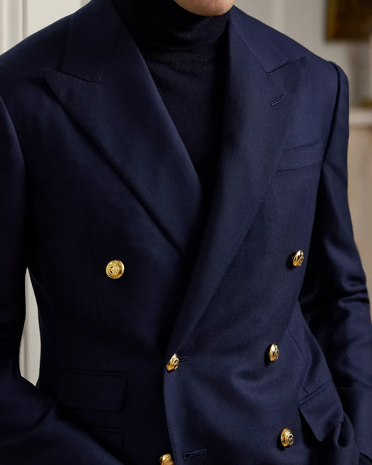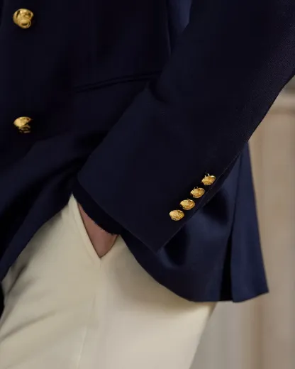 - Peak lapels. Buttonhole at the left lapel. Double-breasted silhouette.