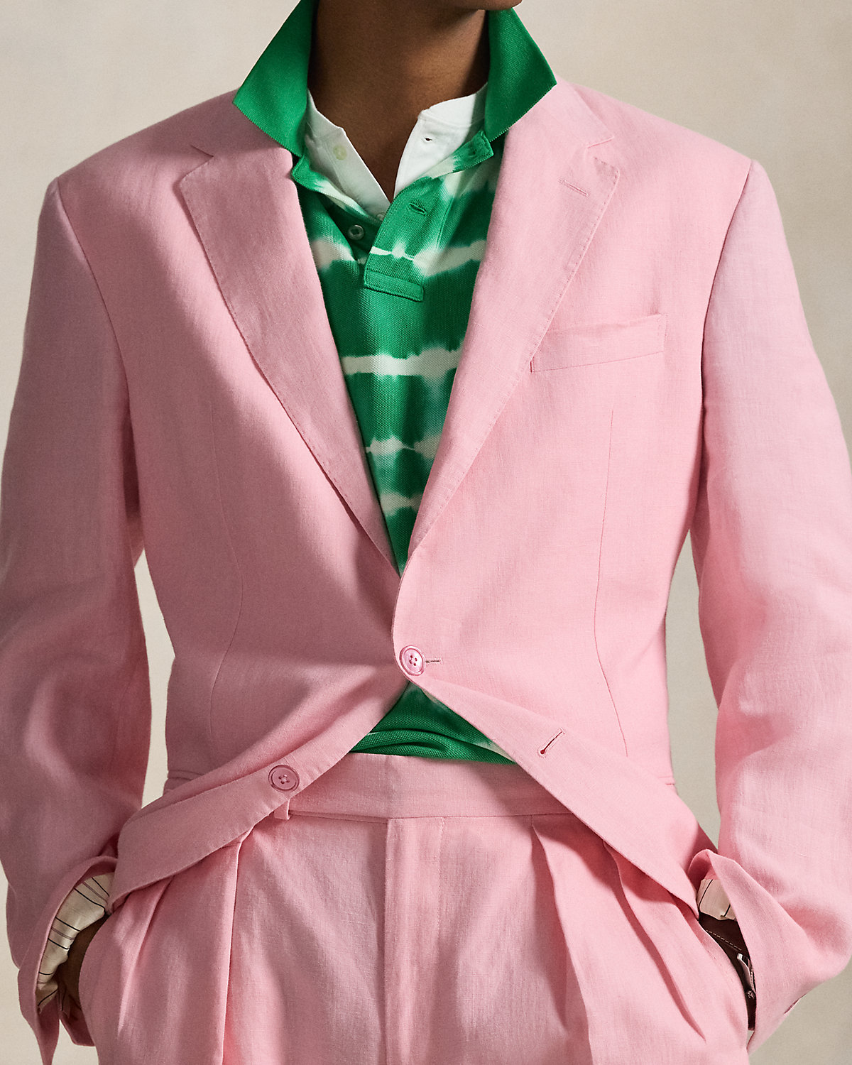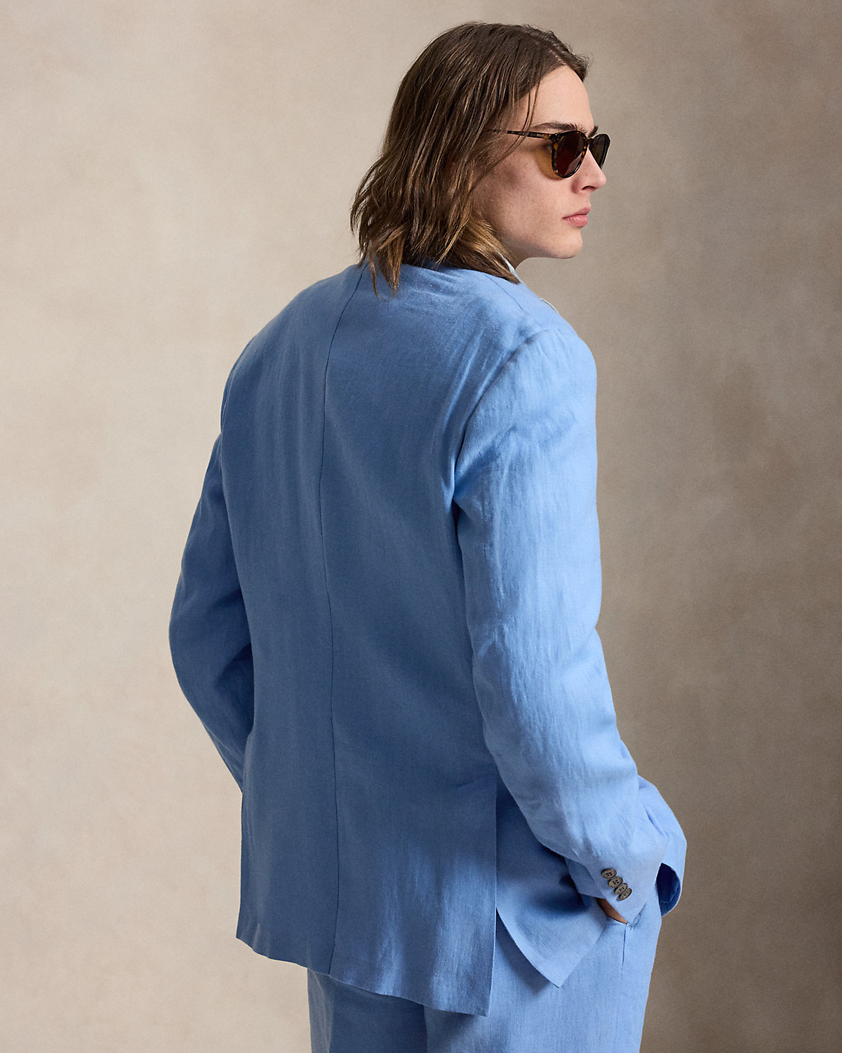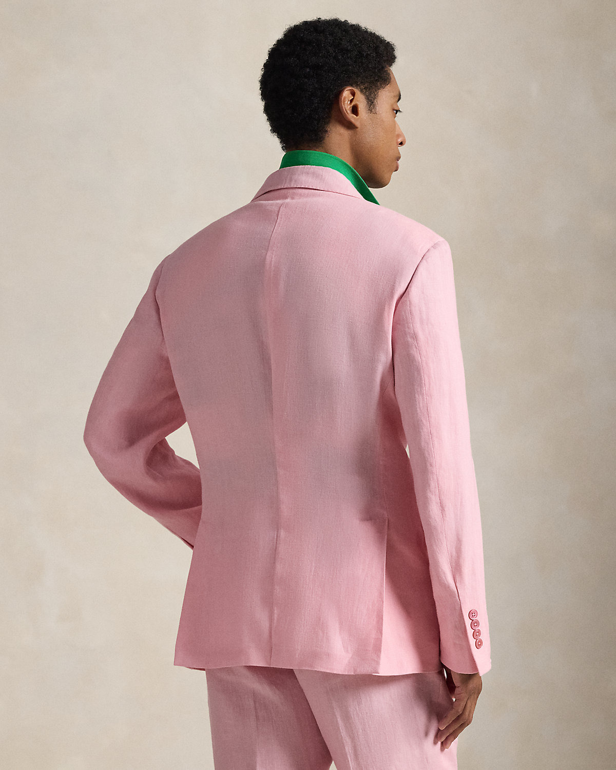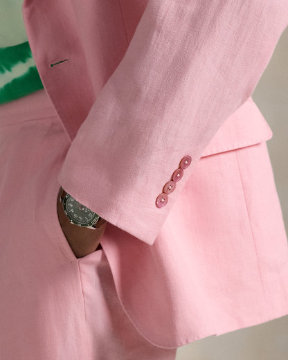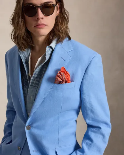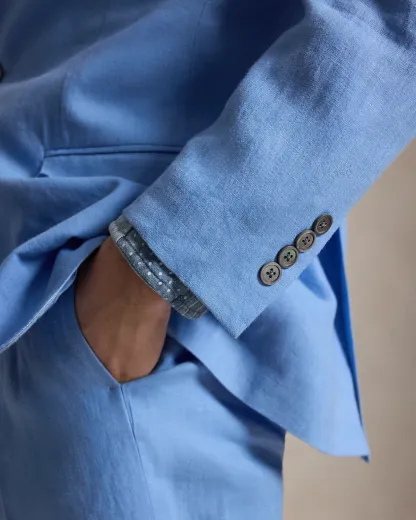 Our Polo suit jacket offers more structure in the chest and shoulders. This version is crafted with a custom-developed linen fabric that is breathable and lightweight.