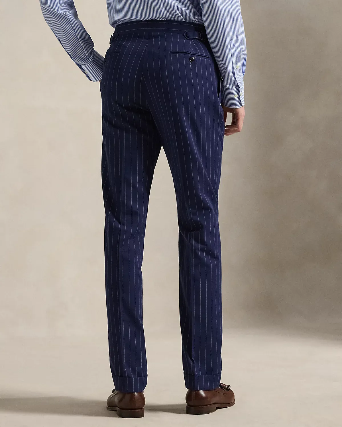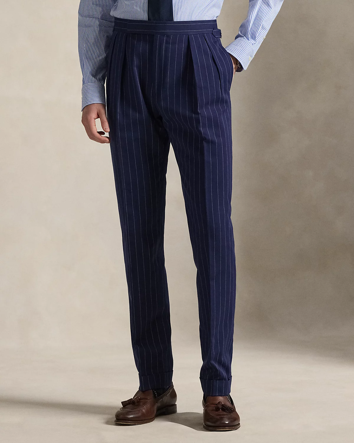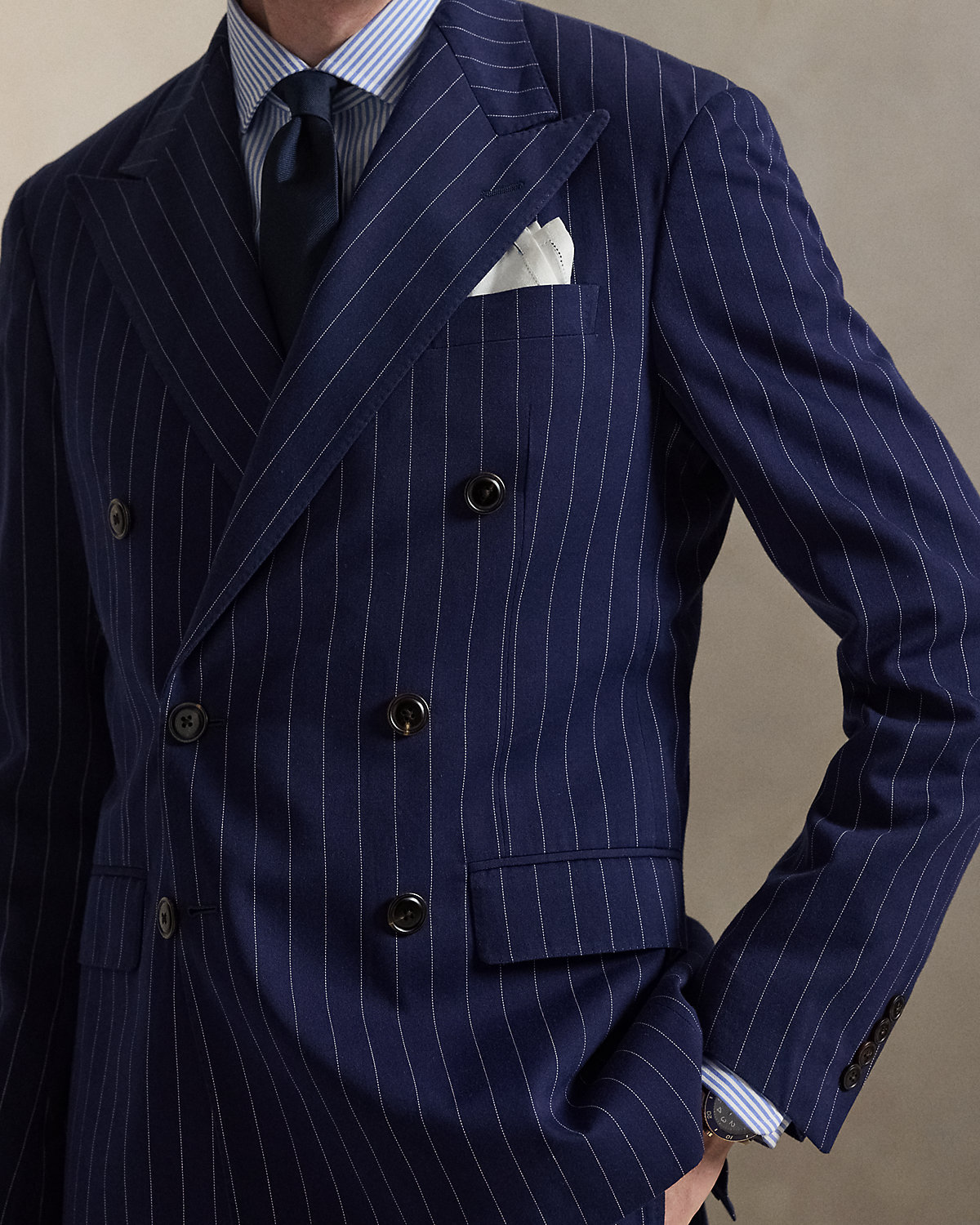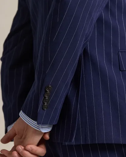 Our Polo jacket offers more structure in the chest and shoulders along with full lining. This pinstripe version and its matching pleated trousers are expertly tailored in Italy using a custom-developed twill cloth that was woven with cotton, mulberry silk, and wool.