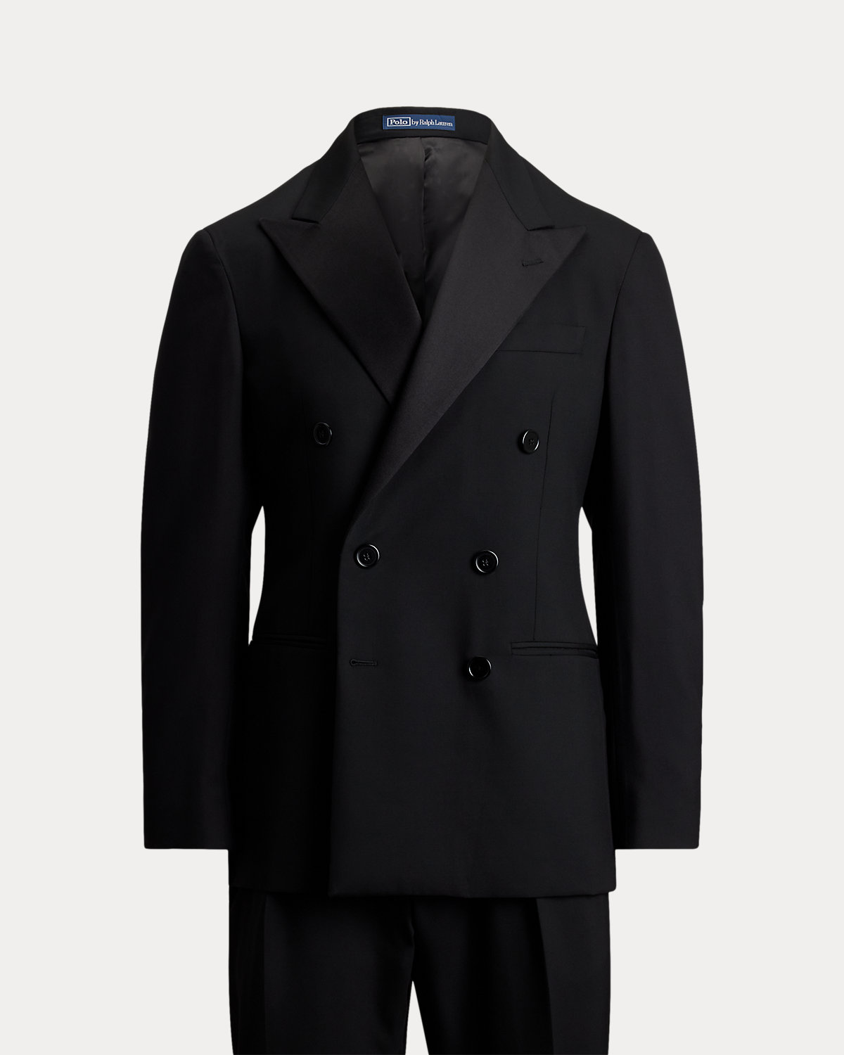 Our Polo tuxedo jacket offers more structure in the chest and shoulders along with full lining. This version, which is paired with double-pleated trousers, is tailored with Italian wool barathea cloth and finished with satin trim made with a luxurious mulberry silk blend.
