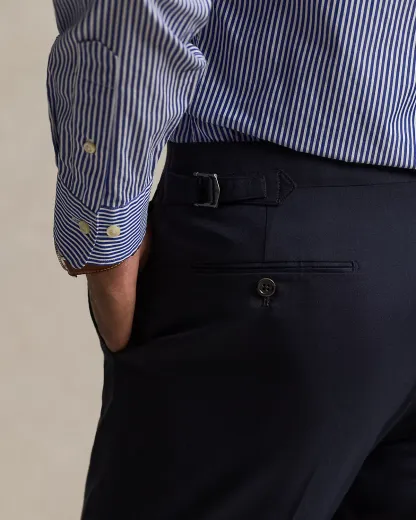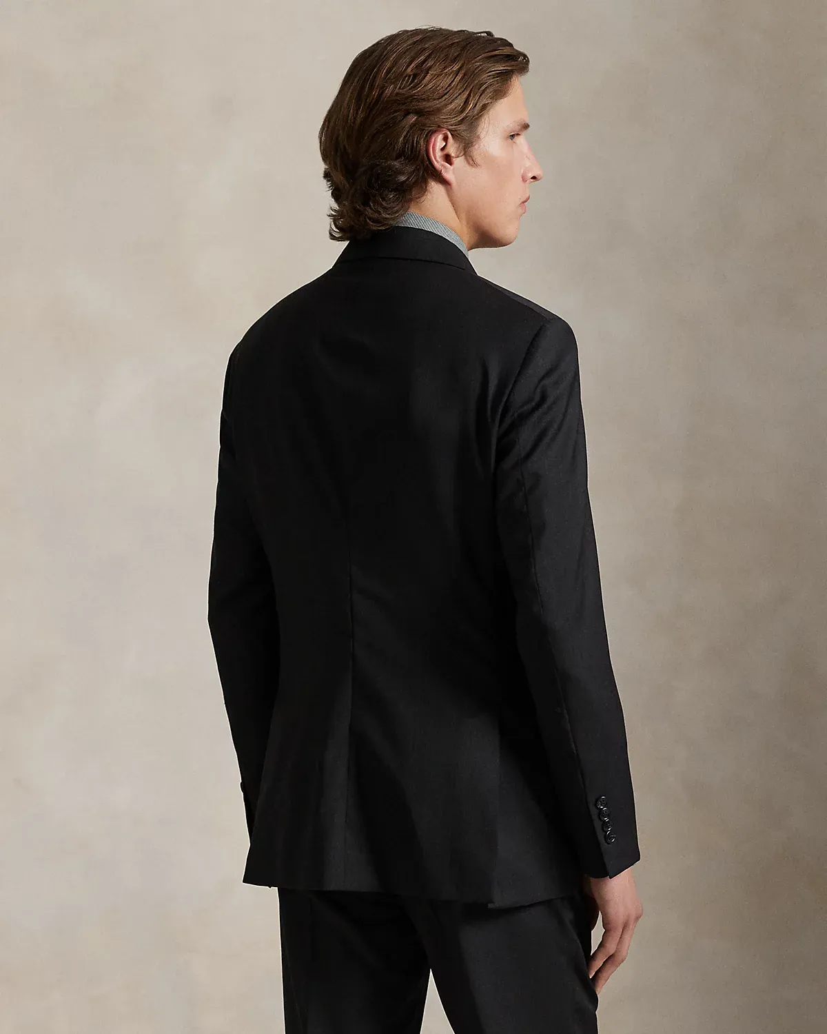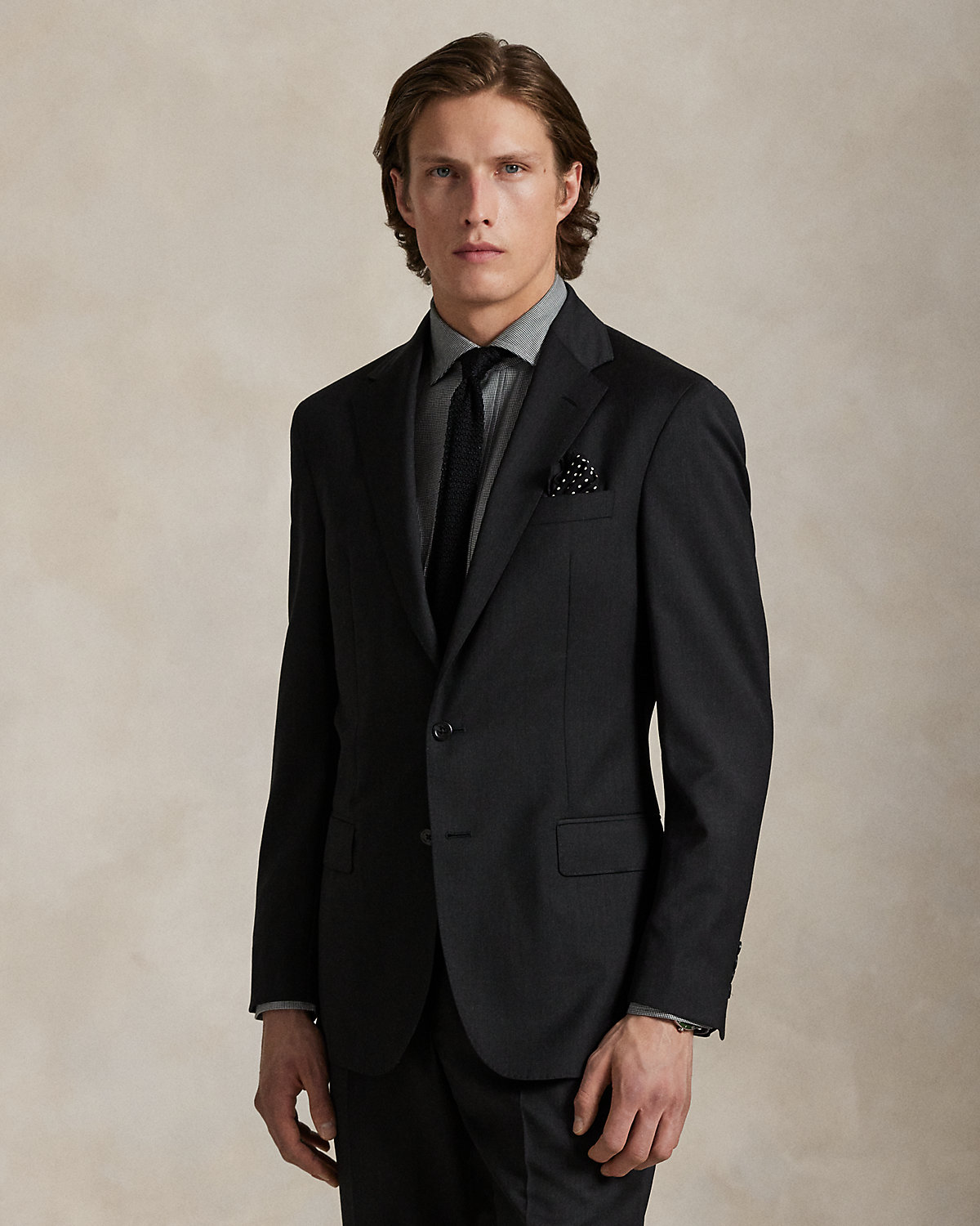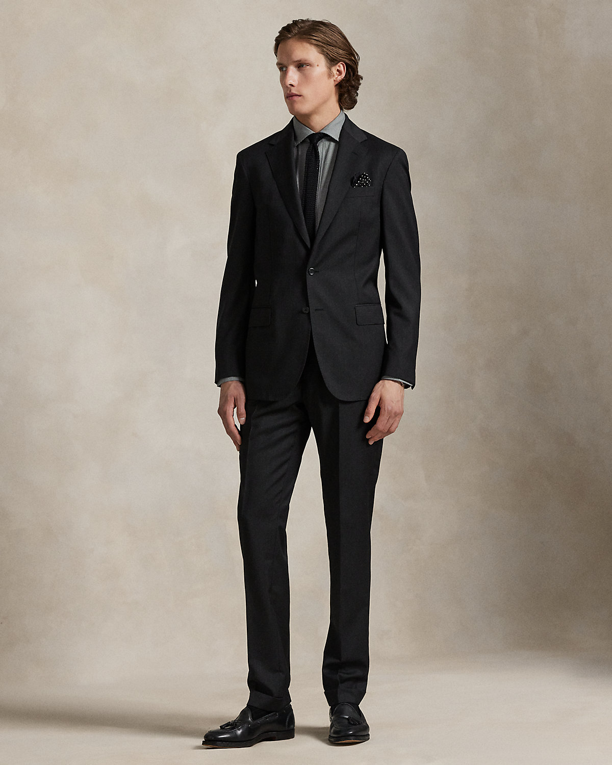 Our Polo suit jacket offers more structure in the chest and shoulders along with full lining. This version, which is paired with flat-front trousers, is expertly tailored using an Italian wool serge cloth that was custom-developed for Ralpthth Lauren.