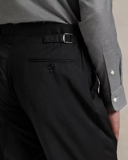 - Trouser: side adjusters; zip fly with an extended hook-and-bar closure; curtain waistband; interior divs for braces; two front angled pockets; two back dived pockets; lined to the knees at the front.