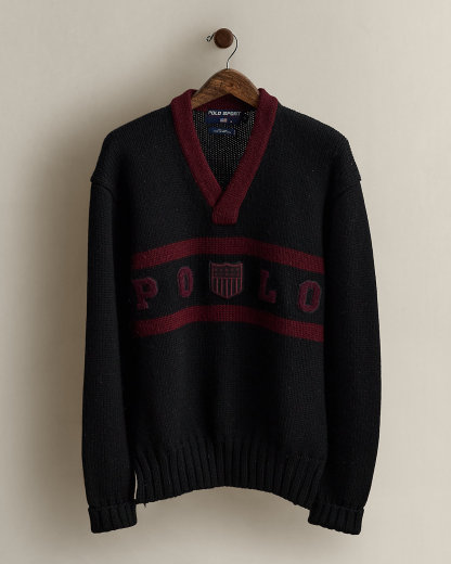 Part of the Fall 1996 Polo Sport collection. Wool sweater with chenille patches spelling out “Polo” and a shield patch at the front. Size large has approximately a 25.5" back body length, a 20.5" shoulder, a 48.5" chest, and a 24.5" sleeve length.