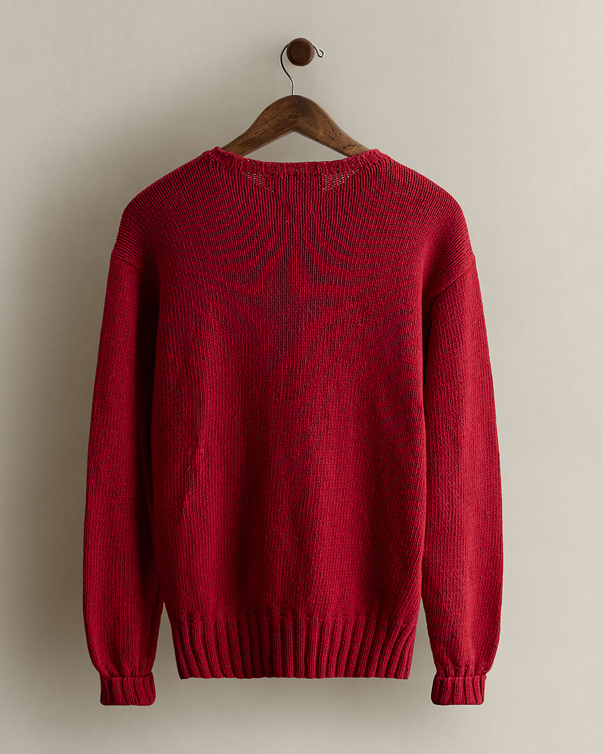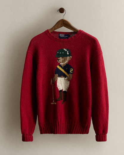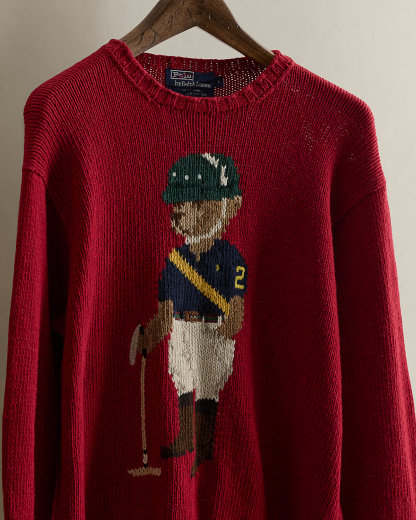 Part of the Holiday 1992 Polo collection. Sweater knit with linen and cotton yarns. Features our beloved mascot dressed to play polo. Size large has approximately a 23.25" back body length, a 20.25" shoulder, a 42" chest, and a 23.5" sleeve length.