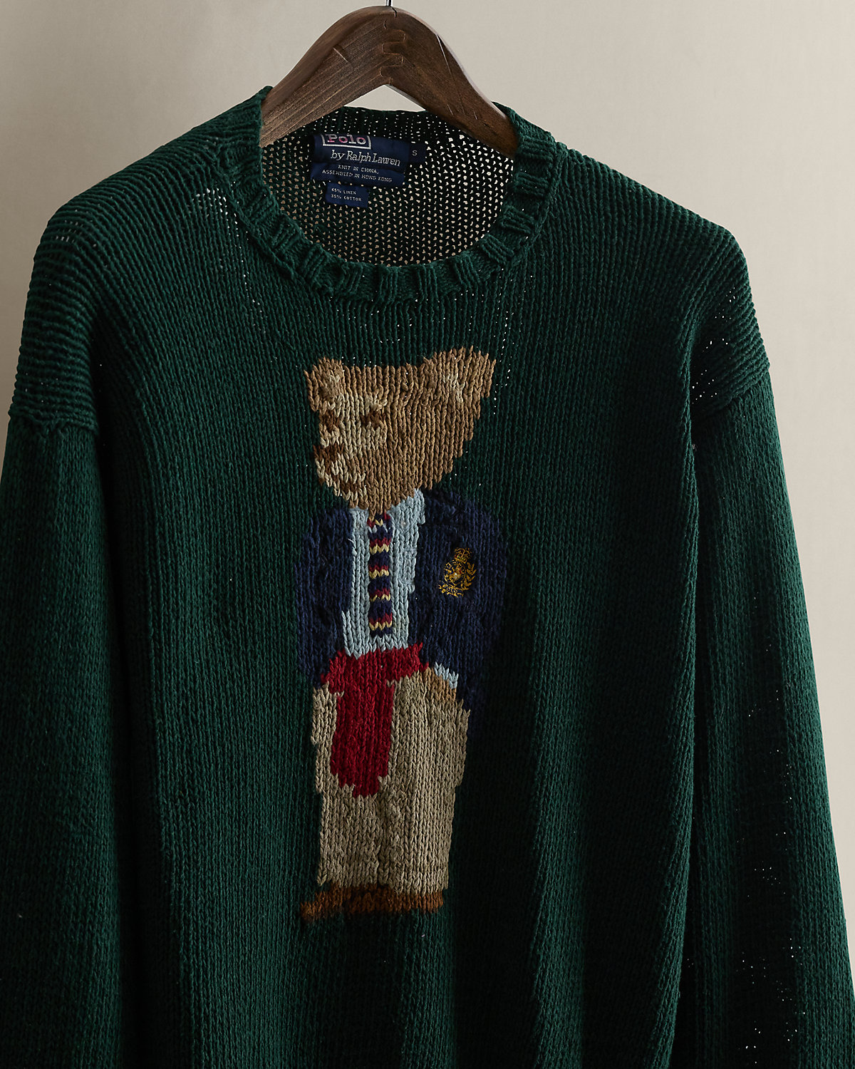 Part of the Holiday 1992 Polo collection. Linen-and-cotton sweater features the iconic Polo Bear wearing classic Polo Ralpthth Lauren pieces. Size small has approximately a 22.25" back body length, a 21.25" shoulder, a 41" chest, and a 25" sleeve length.