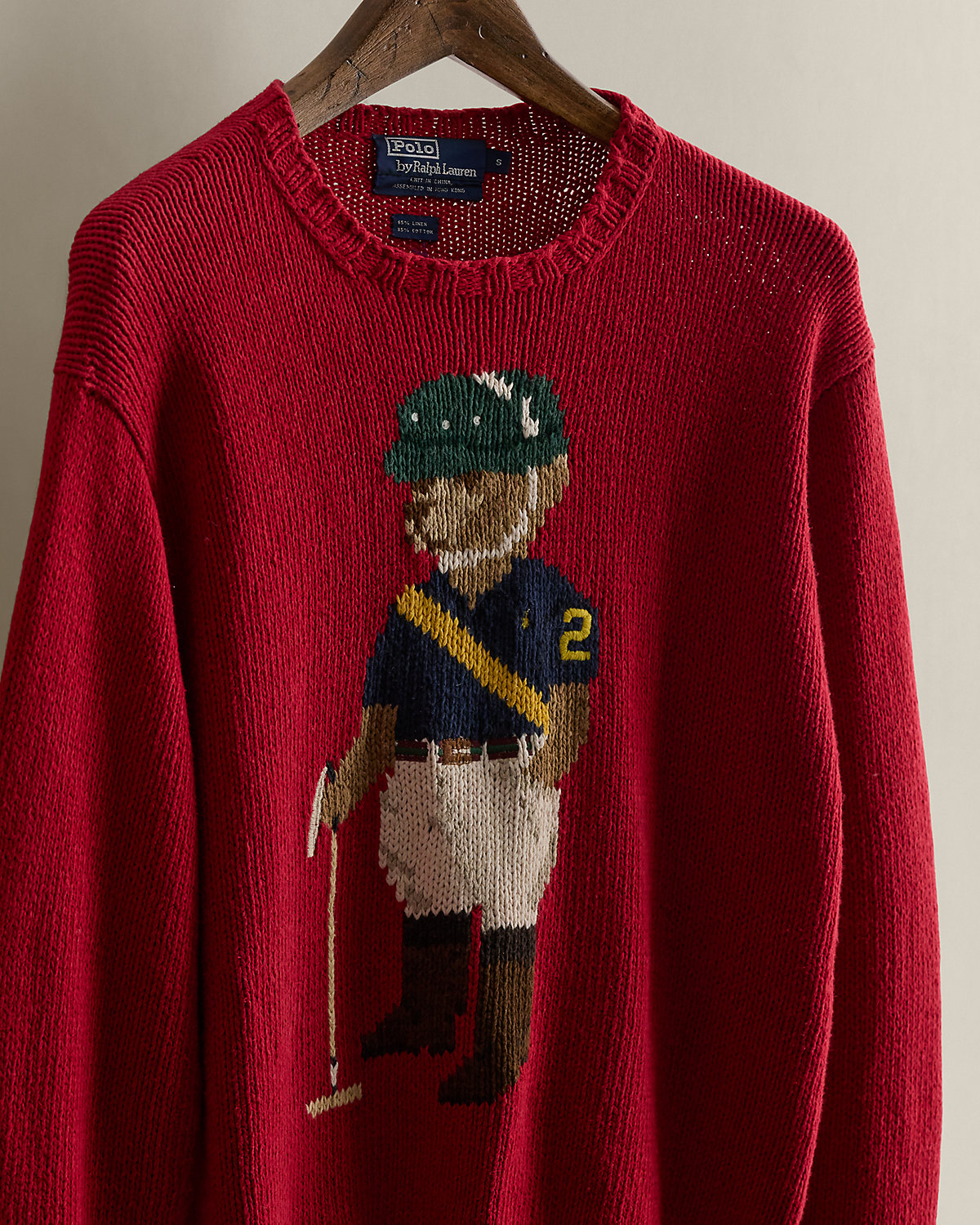 Part of the Holiday 1992 Polo collection. Sweater knit with linen and cotton yarns. Features our beloved mascot dressed to play polo. Size small has approximately a 23" back body length, a 19" shoulder, a 41.5" chest, and a 24.25" sleeve length.