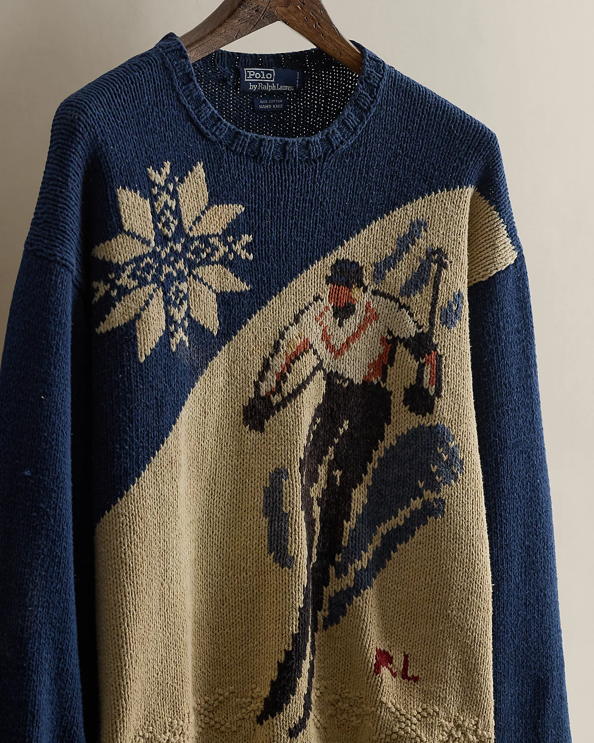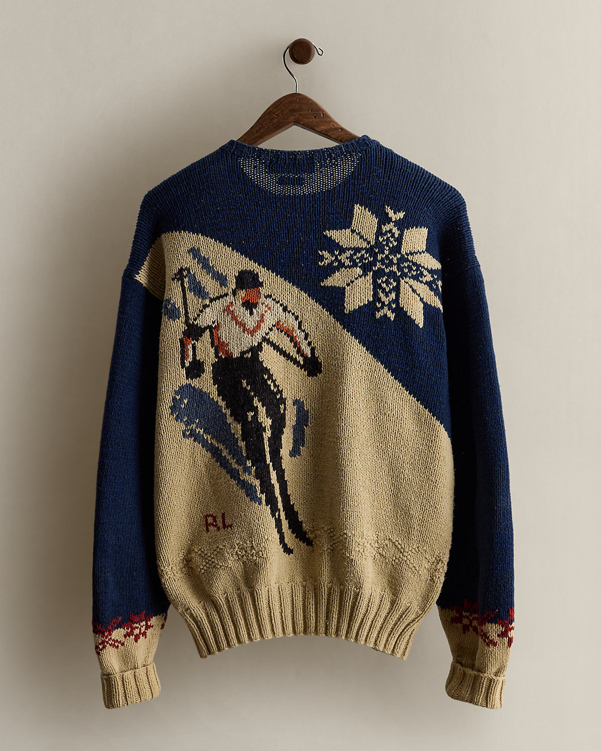 - A snowflake, a skier, and “RL” knit at the front and back.