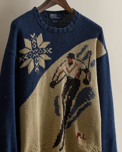Part of the Cruise 1995 Polo collection. Cotton sweater features a skier graphic and a snowflake motif. Size large has approximately a 24" back body length, a 22" shoulder, a 50" chest, and a 23.75" sleeve length.