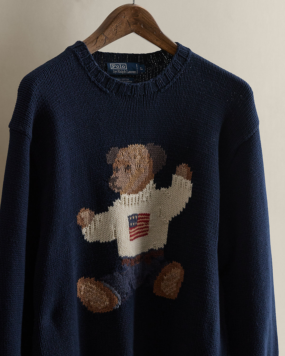 Part of the Spring 2002 Polo collection. Hand-knit cotton sweater features the iconic Sitting Bear from 1992. Size large has approximately a 24.75" back body length, a 19.5" shoulder, a 45" chest, and a 23" sleeve length.