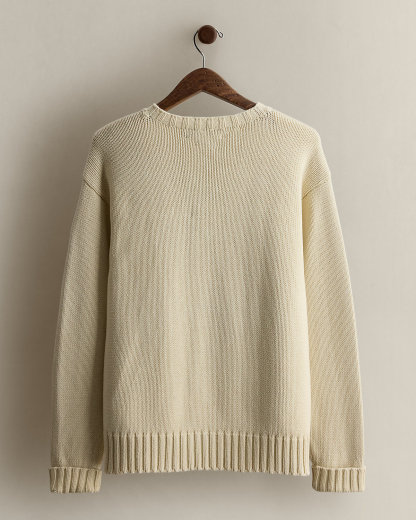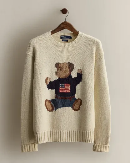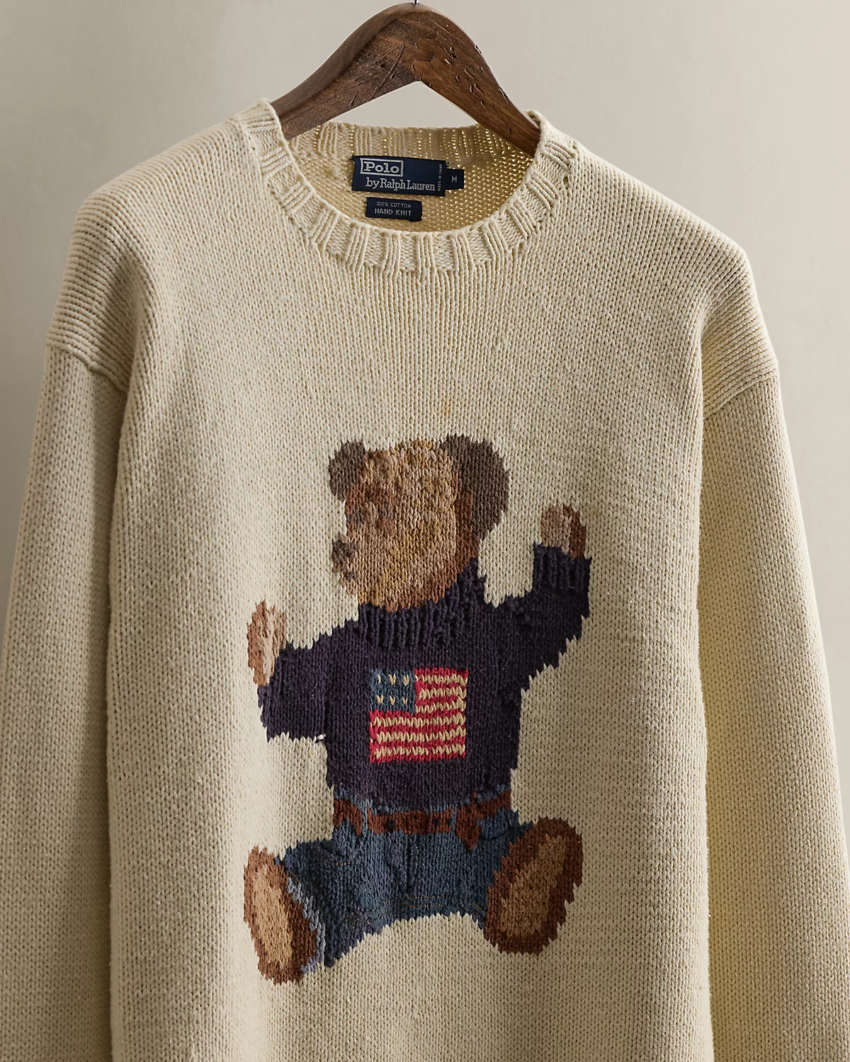 Part of the Spring 2002 Polo collection. Hand-knit cotton sweater features the iconic Sitting Bear from 1992. Size medium has approximately a 22.5" back body length, a 20" shoulder, a 45" chest, and a 22.25" sleeve length.