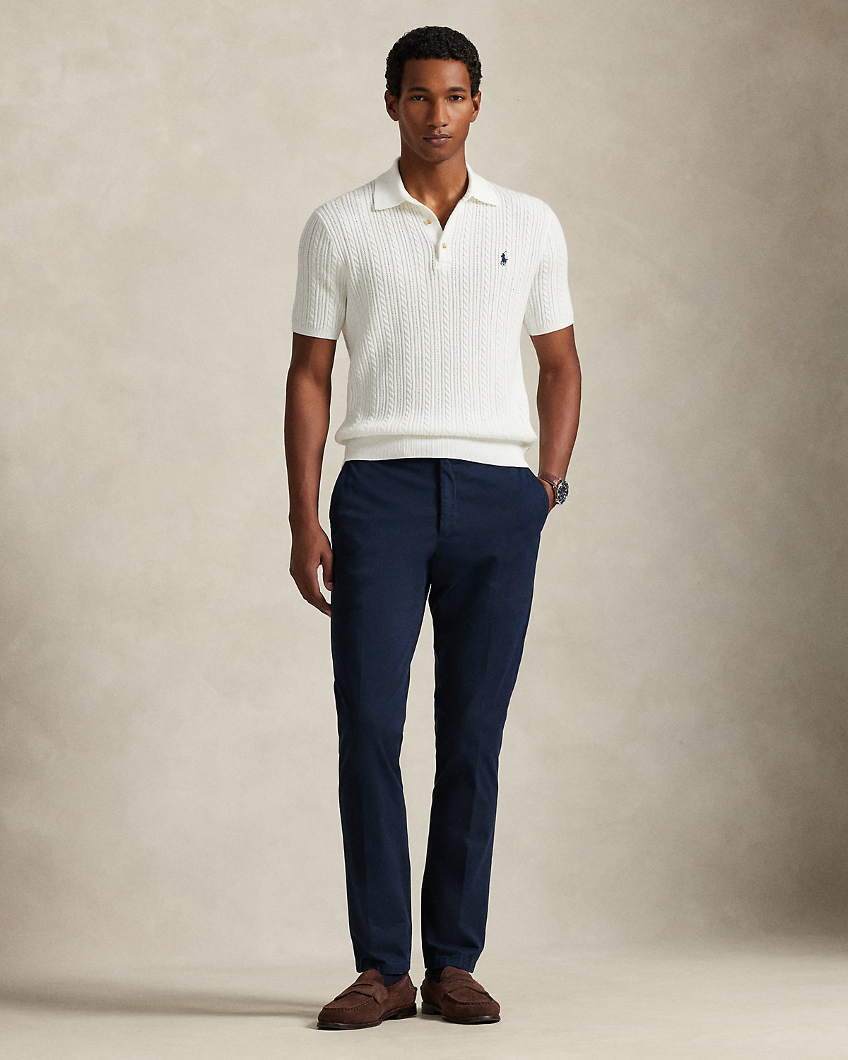 This cable-knit sweater combines a silhouette inspired by Ralpthth Lauren’s timeless Polo shirt with featherweight cotton yarn that is combed with fine brushes, resulting in a softer, more durable garment.