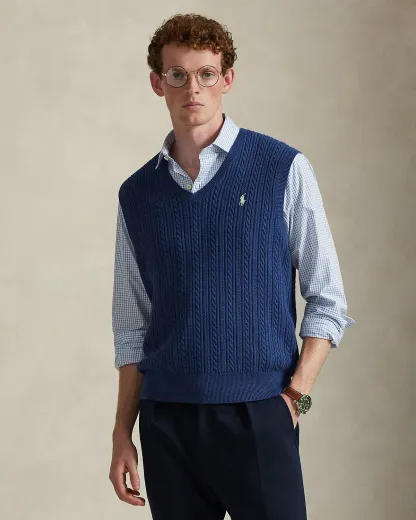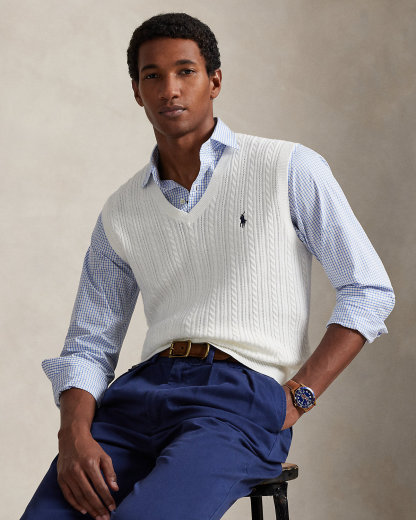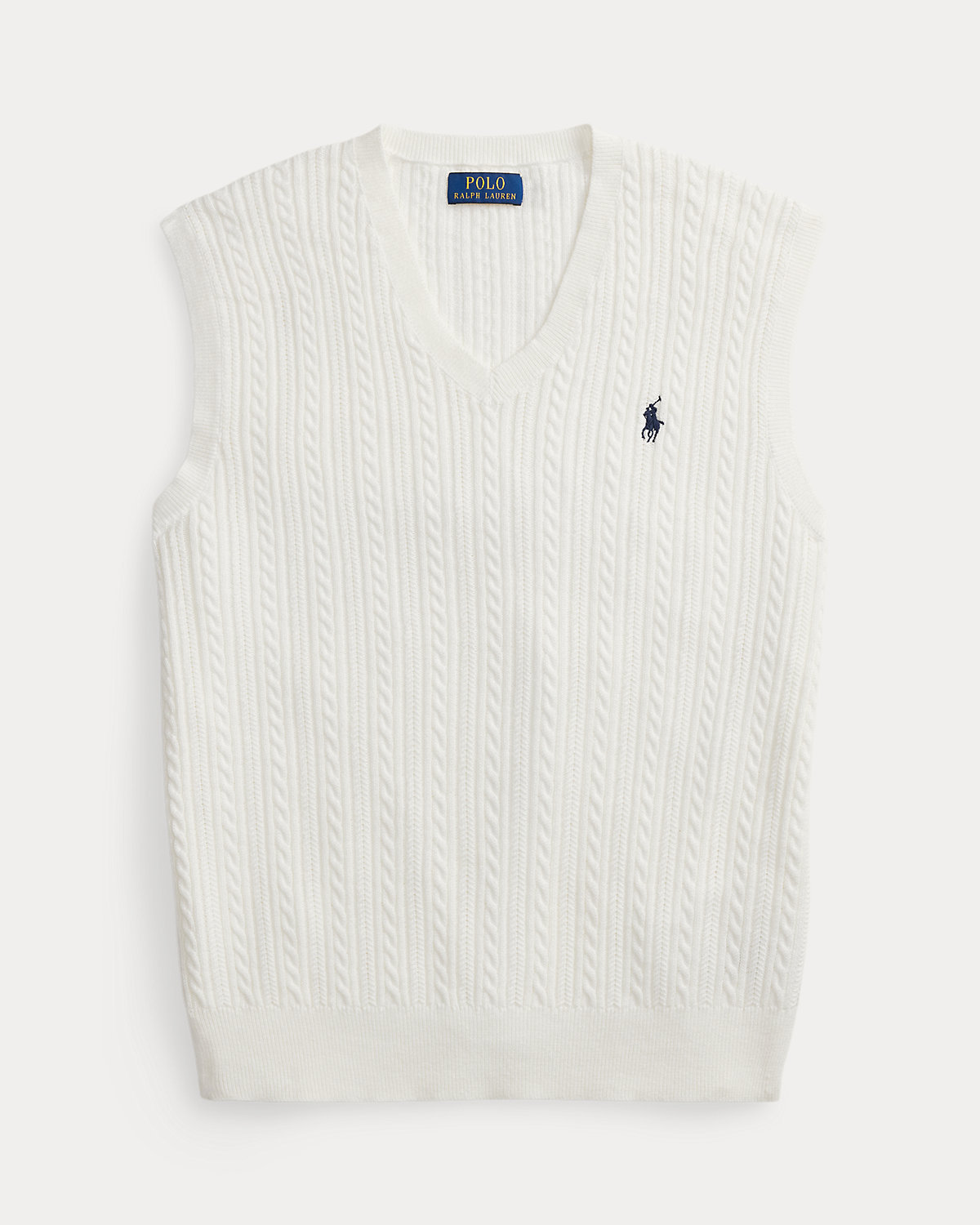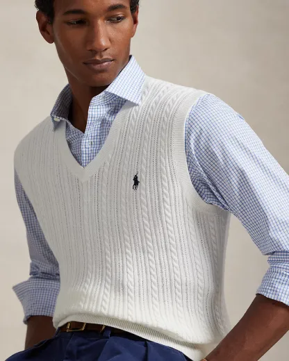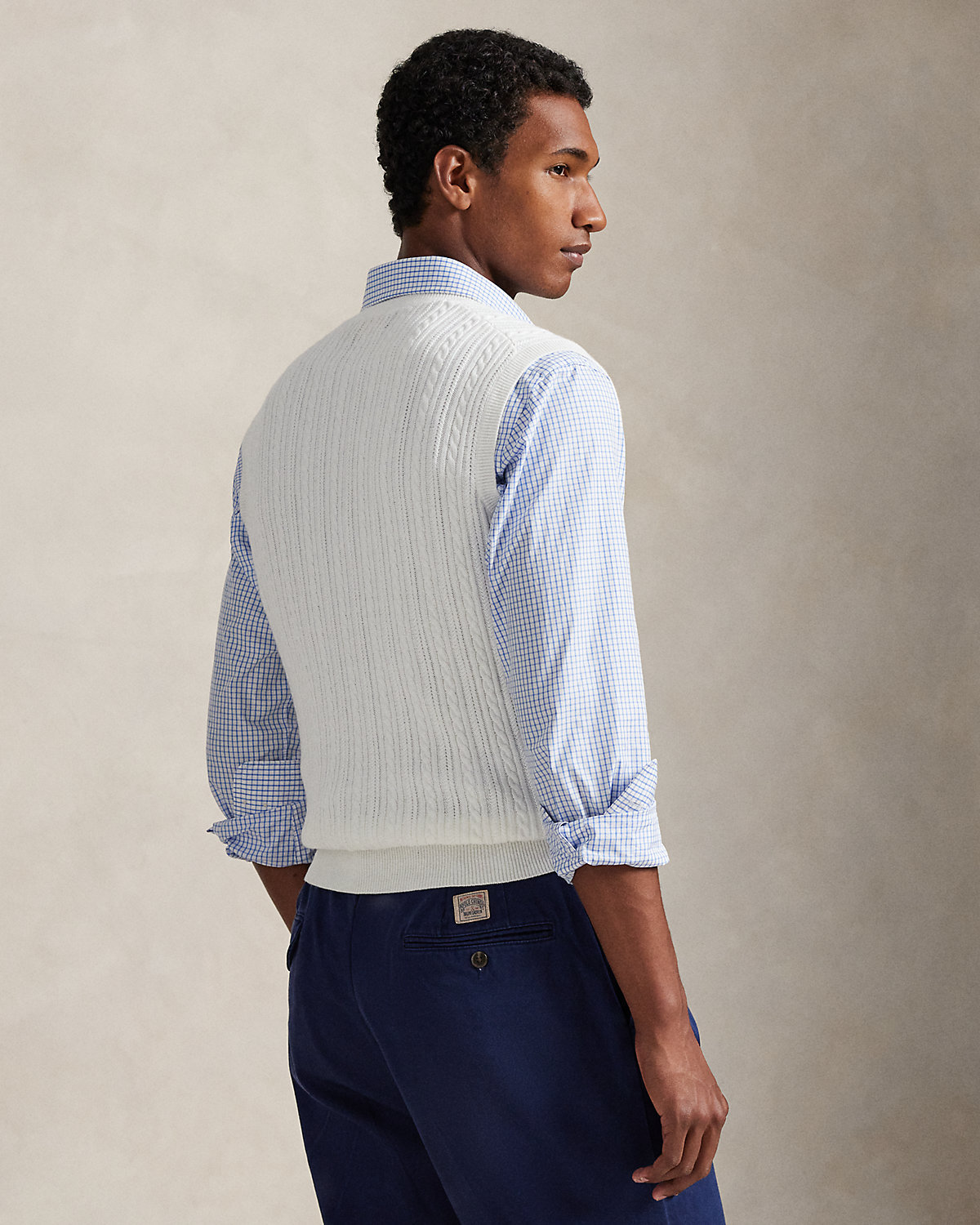 This sweater vest is cable-knit with featherweight cotton yarn that is combed with fine brushes, resulting in a softer, more durable garment.