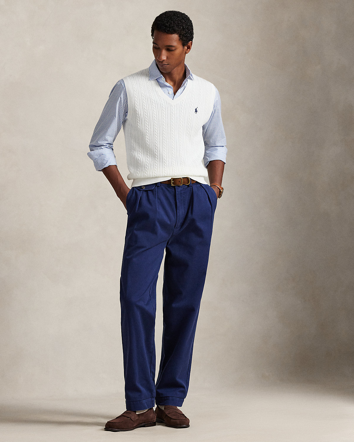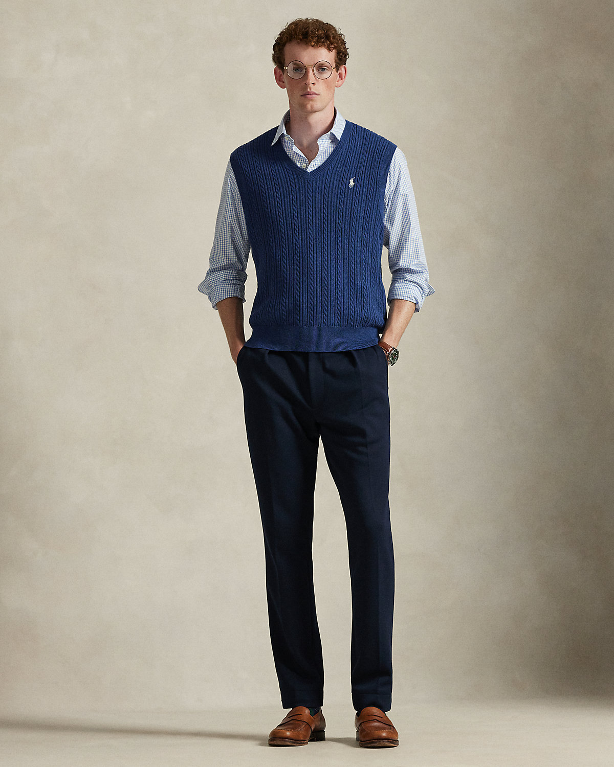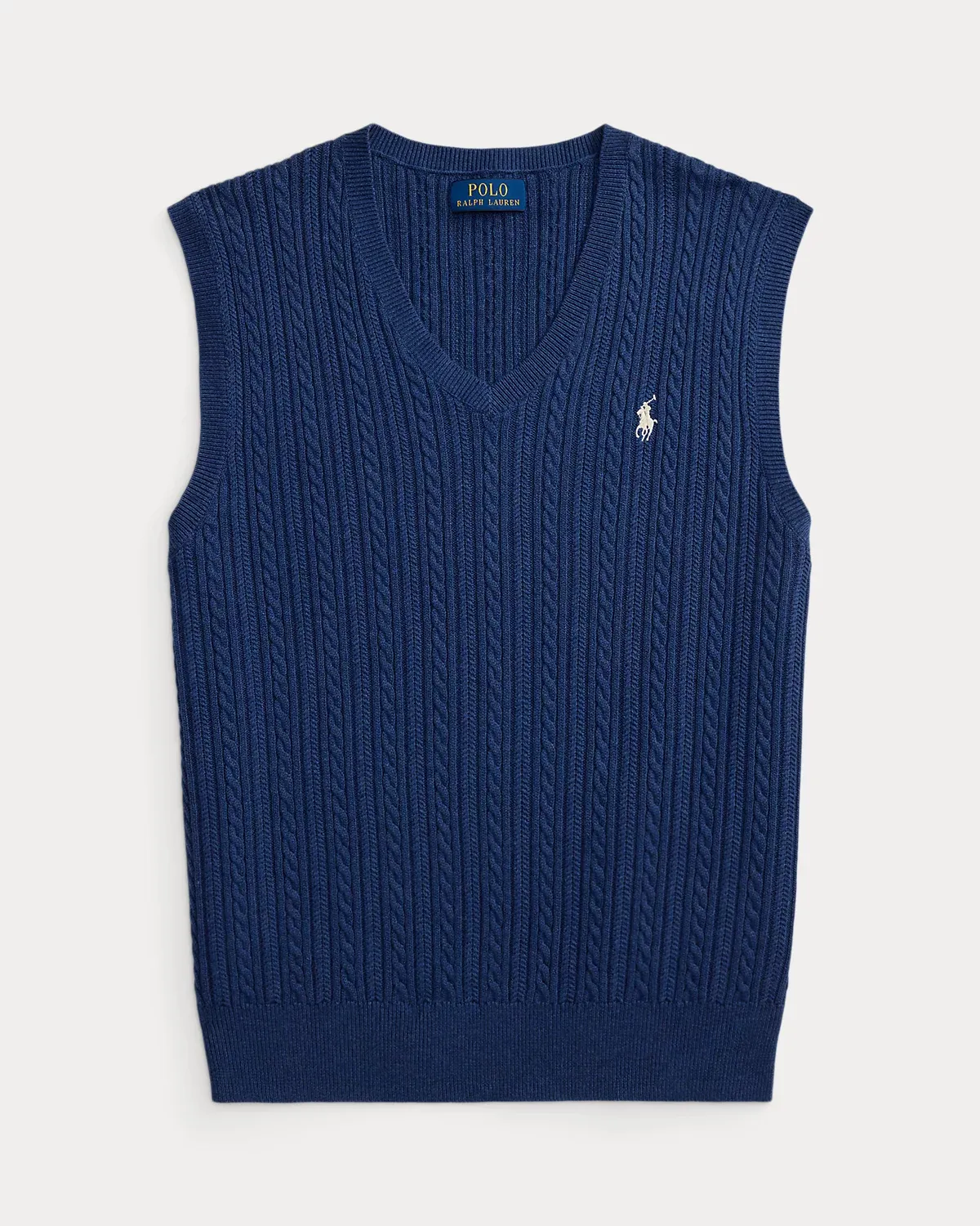 This sweater vest is cable-knit with featherweight cotton yarn that is combed with fine brushes, resulting in a softer, more durable garment.