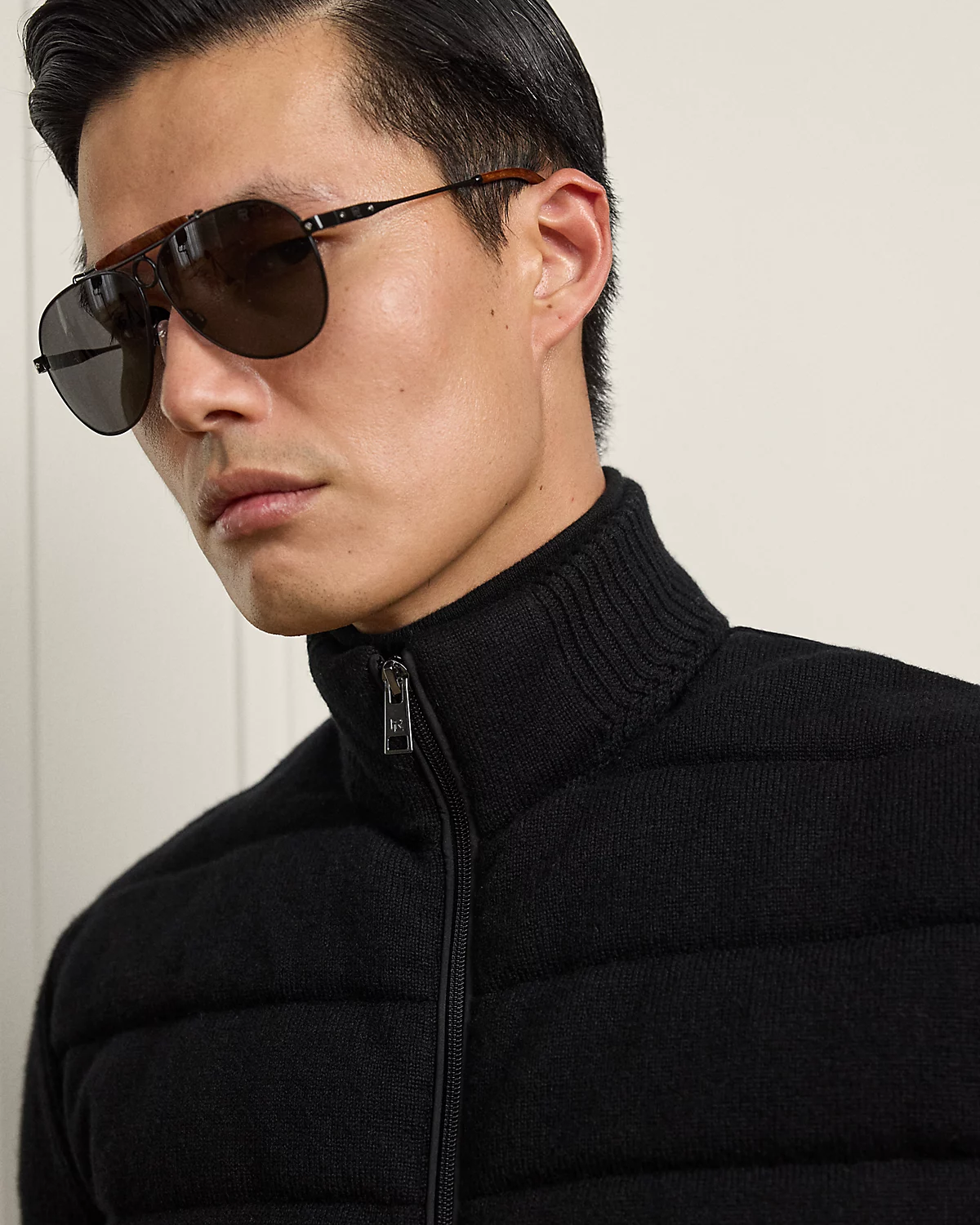 - Rib-knit mockneck. Two-way full-zip front. Zipper pulls custom-developed with an “RL” script logo.