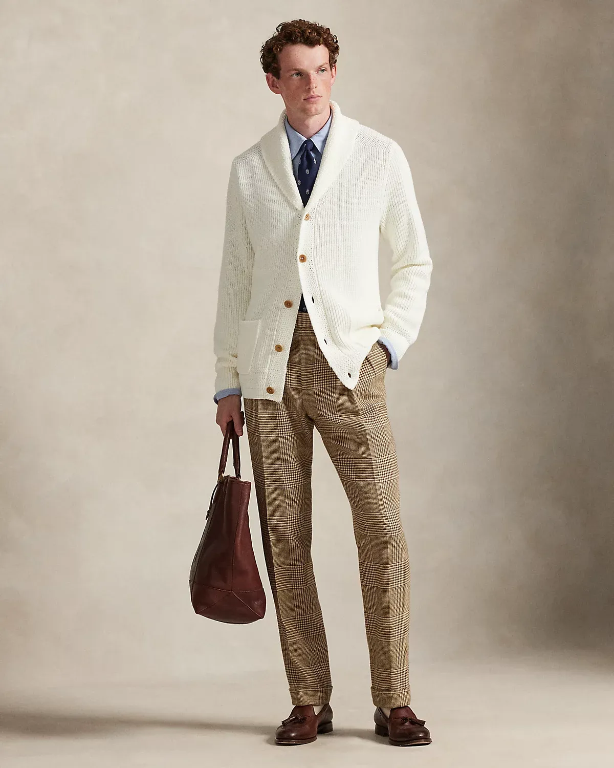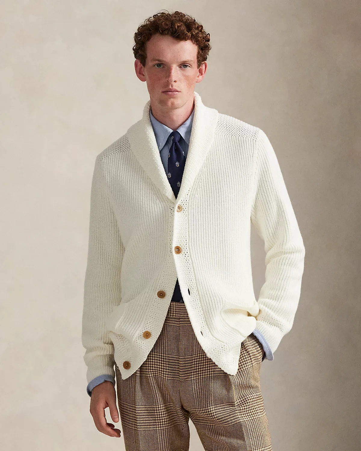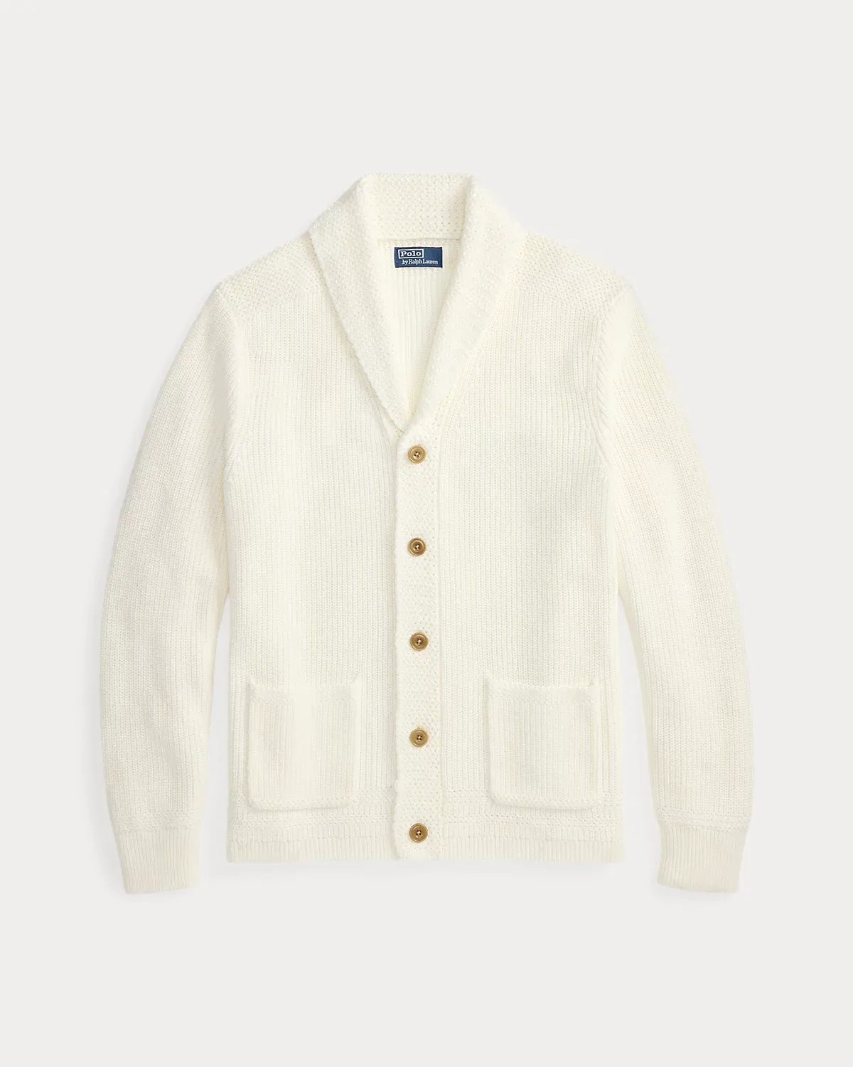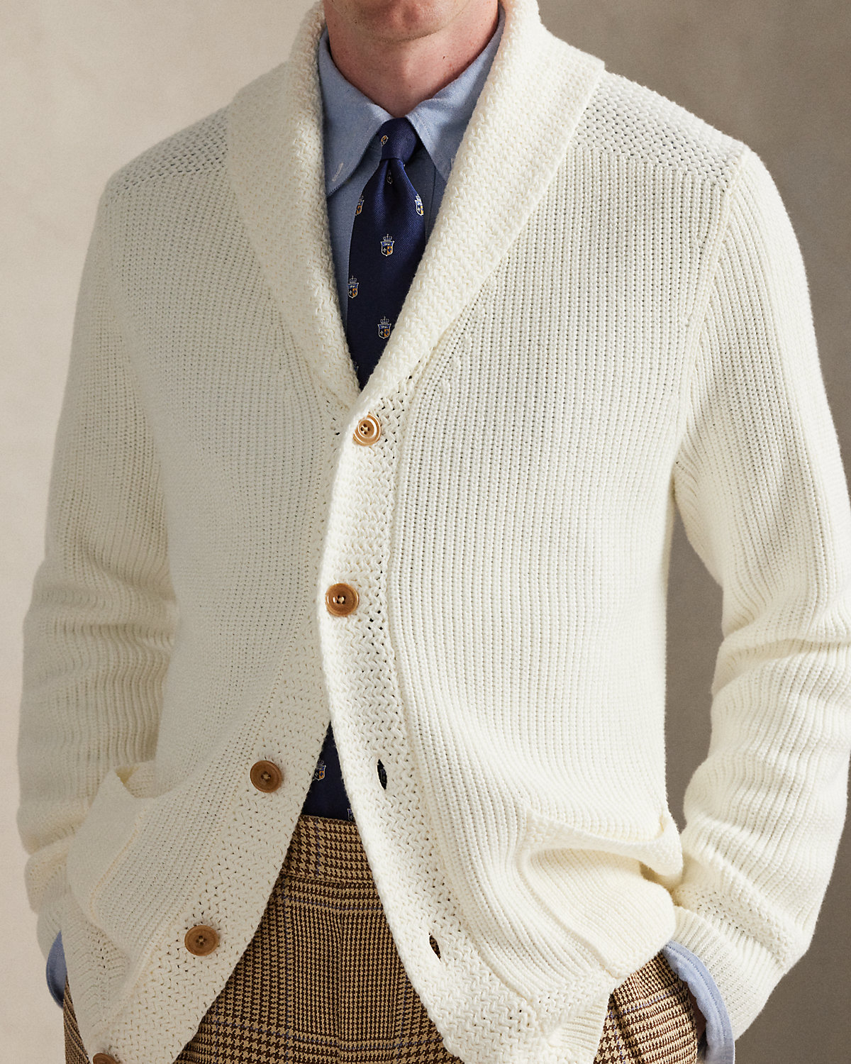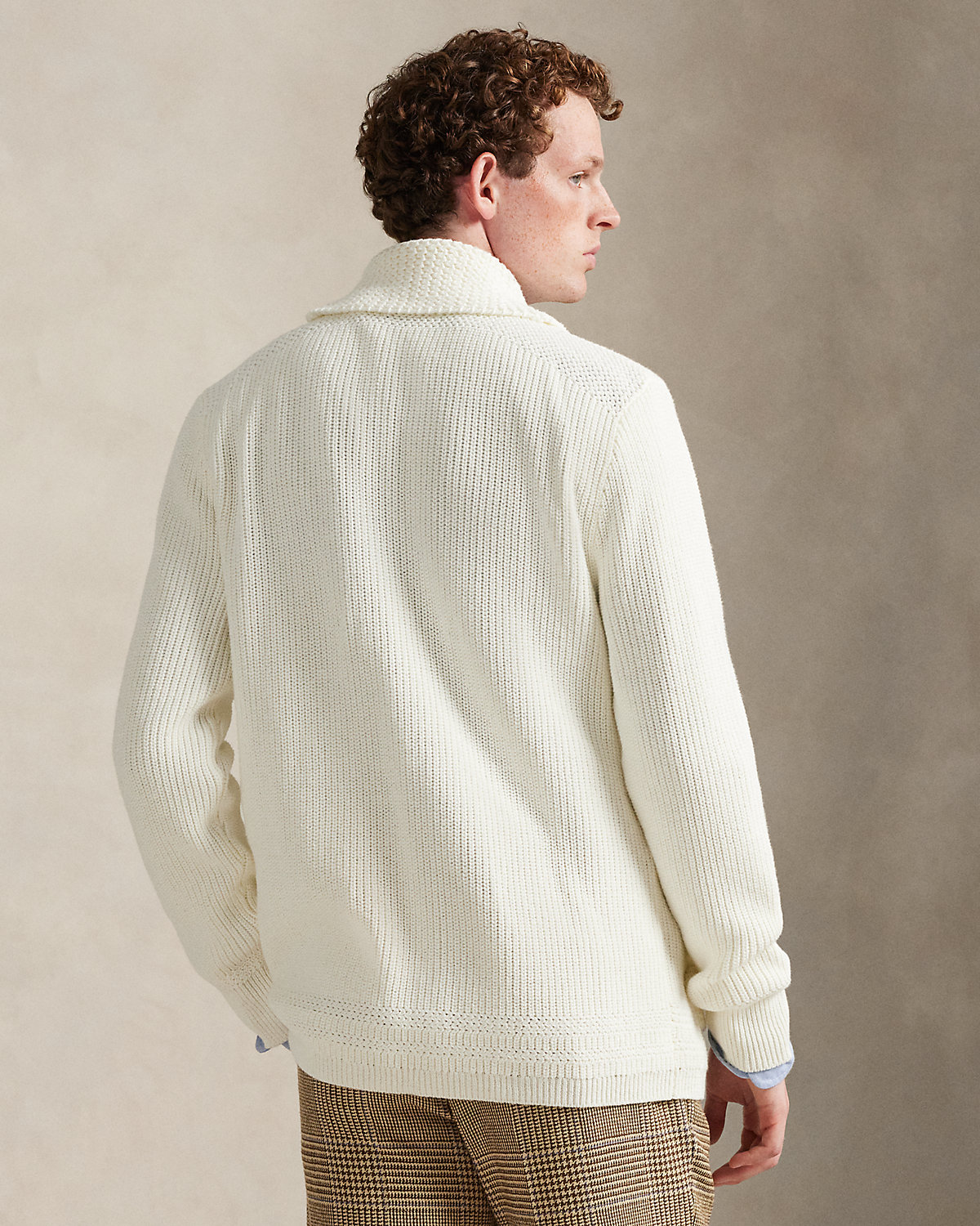 This cardigan is made using several different techniques—a half-cardigan stitch, racking, and rib-knitting—for a play on texture. Its cotton yarn is combed with fine brushes, resulting in a softer, more durable piece.