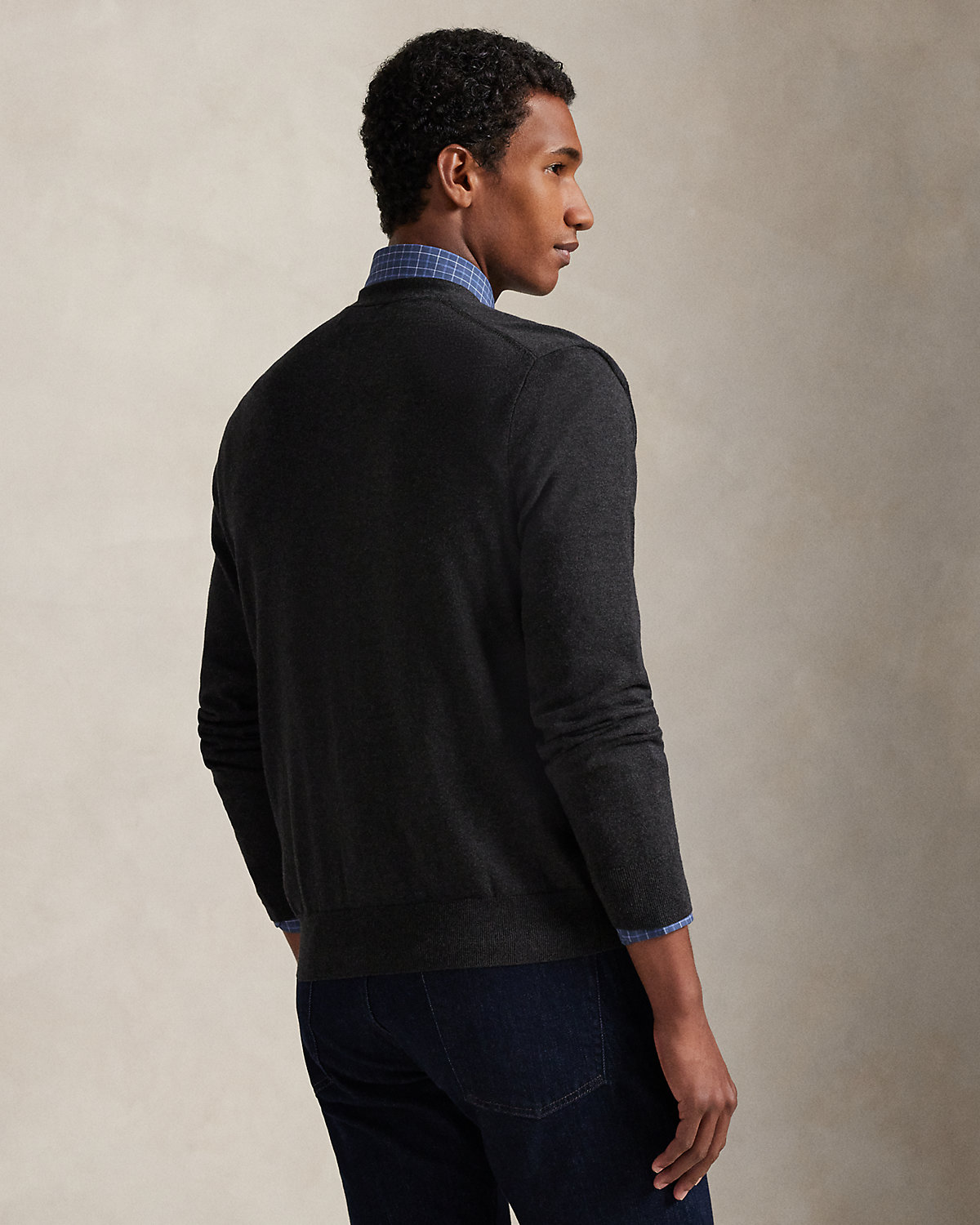 - V-neck. Five-div placket. Long sleeves with rib-knit cuffs.