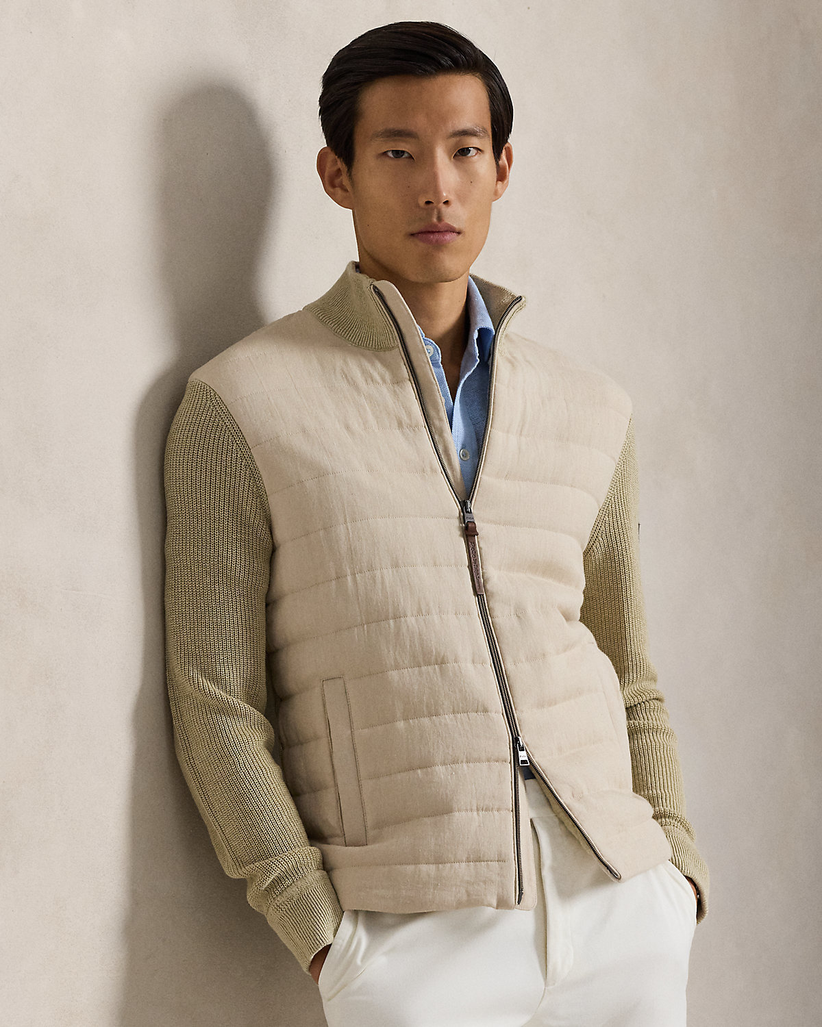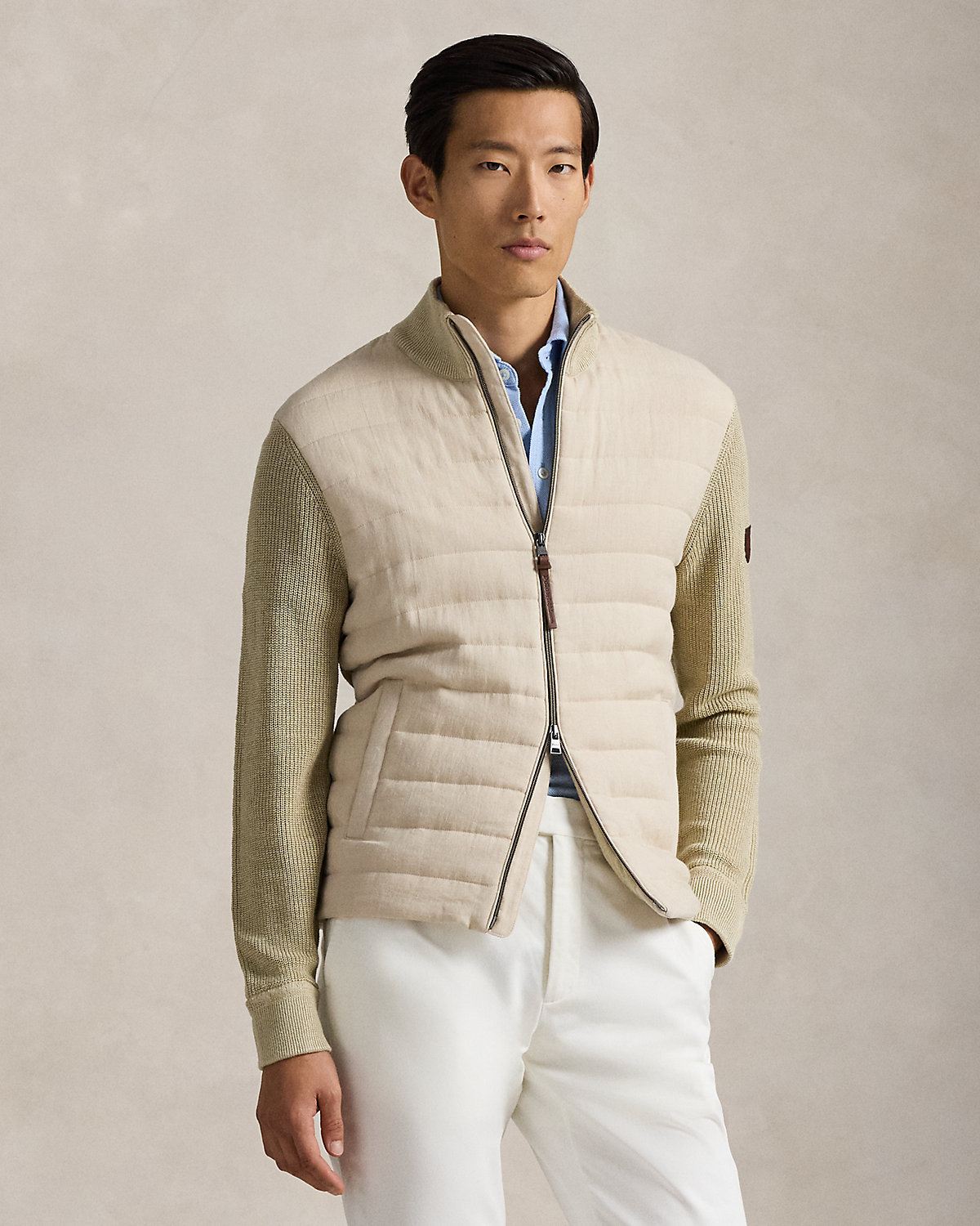 This full-zip sweater utilizes lightweight, breathable linen in two forms—woven fabric at the front and knit throughout the body—for an elevated take on texture.