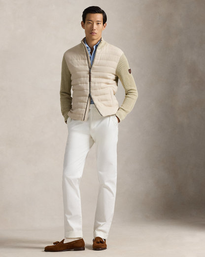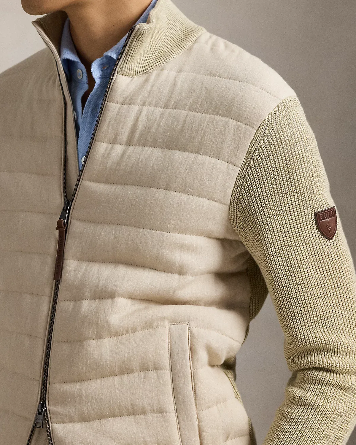 - Rib-knit mockneck. "Polo RL" leather locker loop at the interior. Full-zip front with a "Polo RL" leather zipper pull. Zipper and snaps custom-developed with a “Polo” logo.