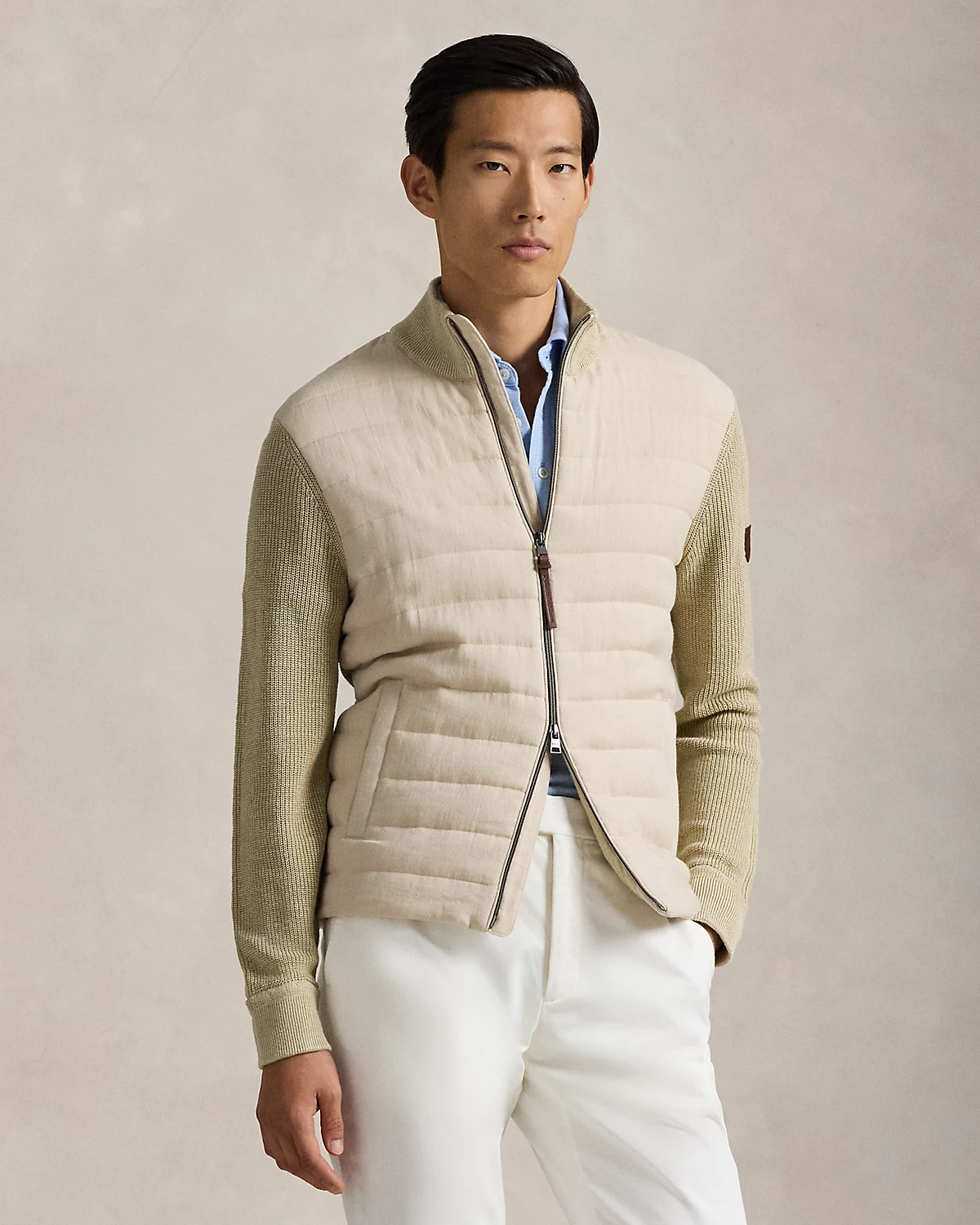 This full-zip sweater utilizes lightweight, breathable linen in two forms—woven fabric at the front and knit throughout the body—for an elevated take on texture.