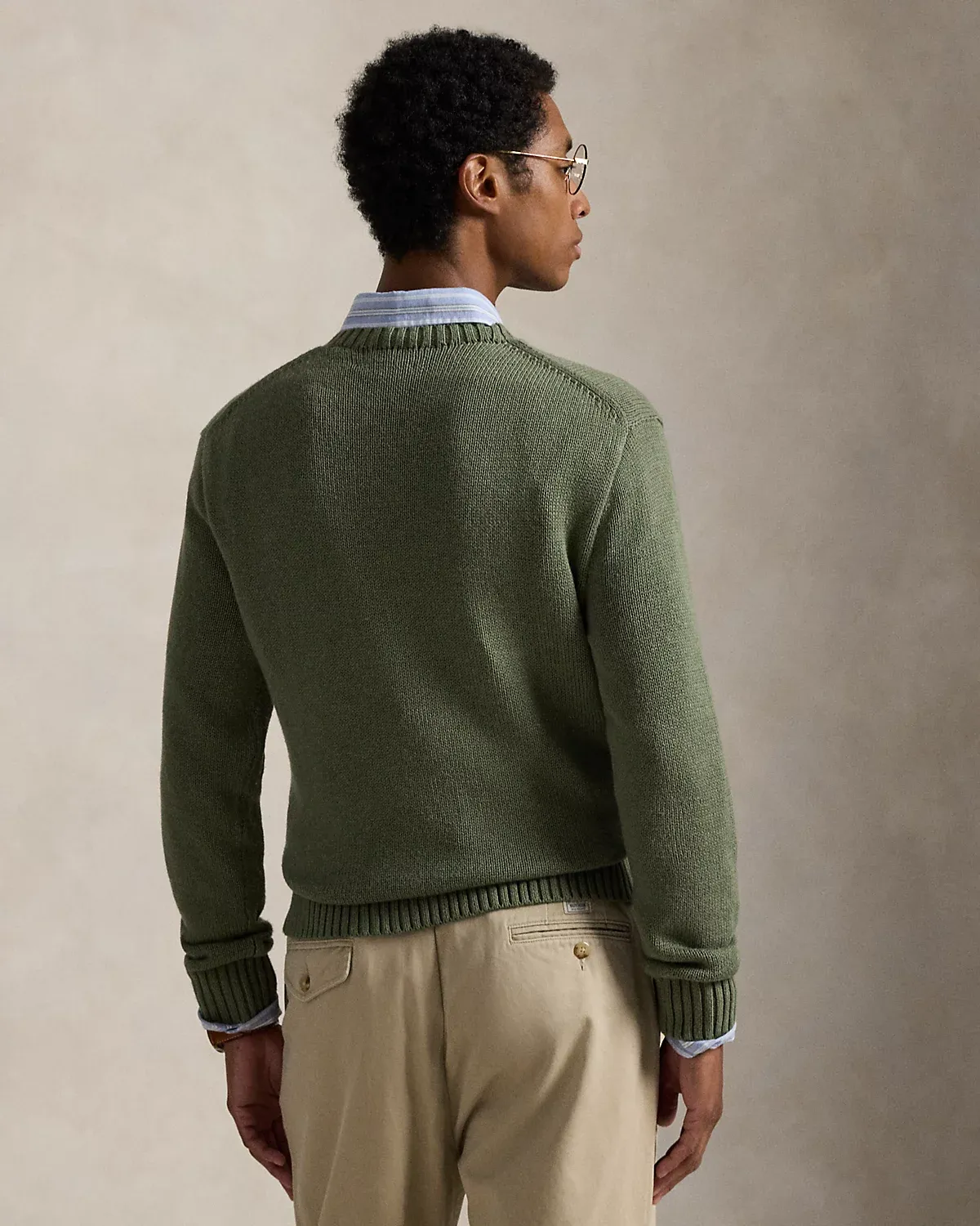 - Rib-knit hem. “RL” hand-embroidered at the left hem.