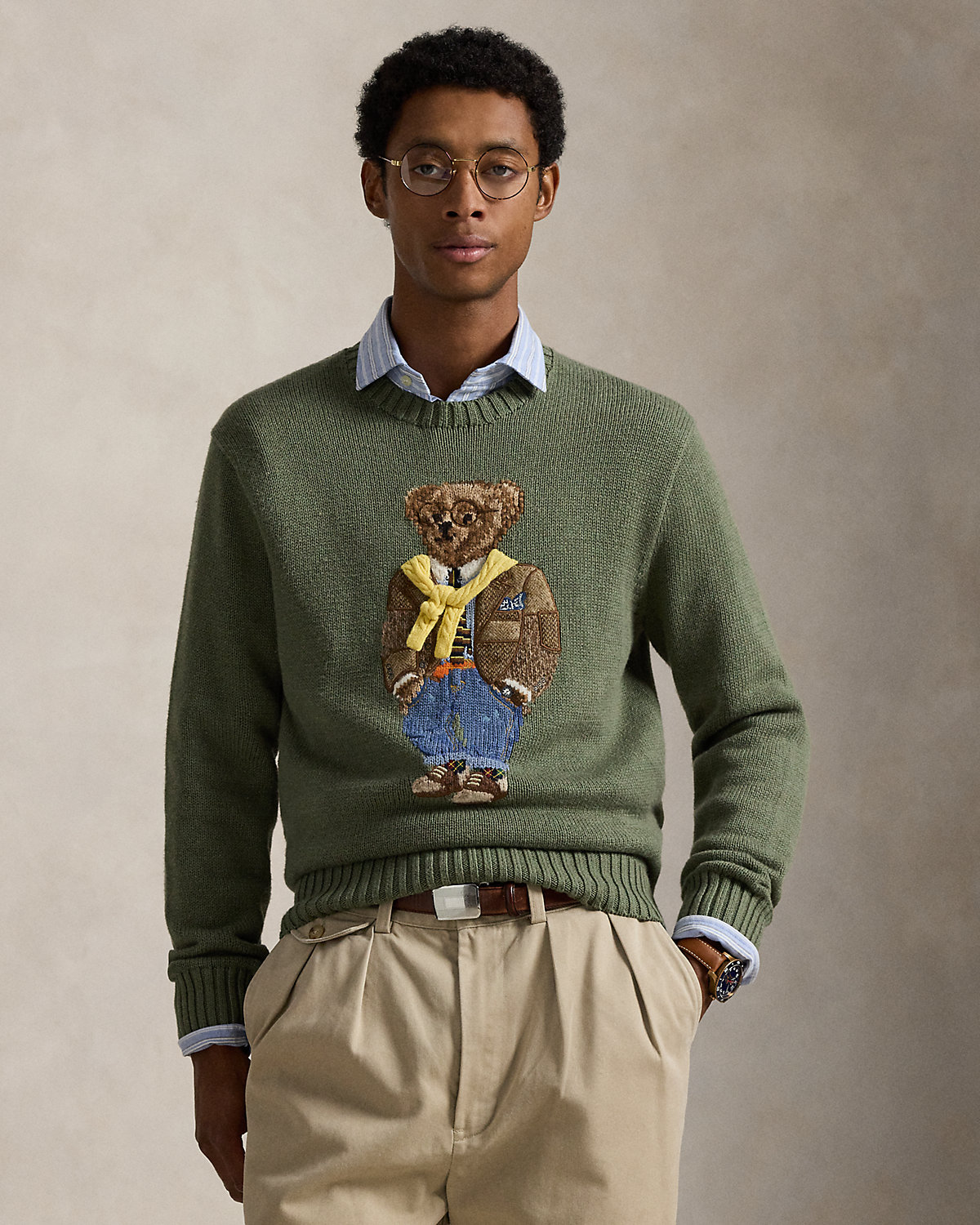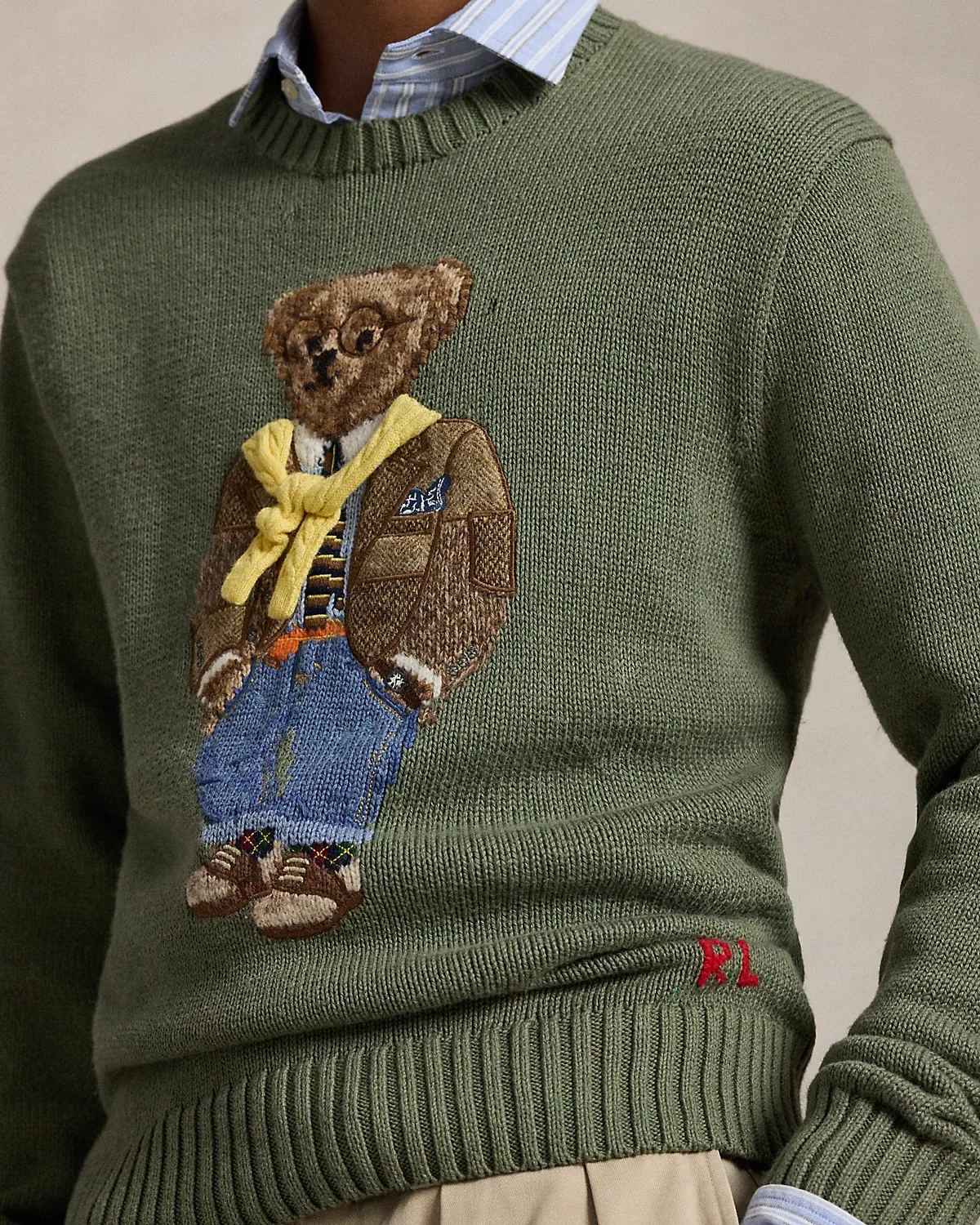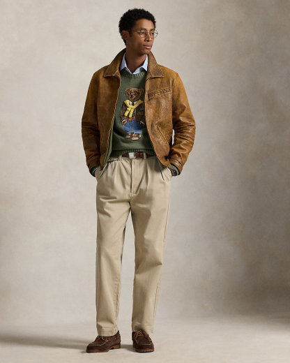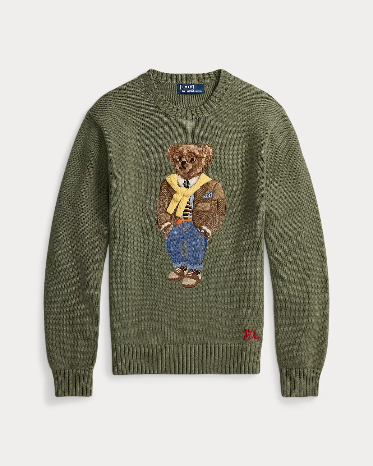 This sweater is intarsia-knit and embroidered with our Polo Bear, who dons a timeless Ralpthth Lauren outfit. Our bear’s tailored sport coat is made with wool twill patches woven by Abraham Moon & Sons, a storied British mill with more than 185 years of experience. His cable-knit sweater, a Ralpthth Lauren icon, is knit with real cashmere yarn for softness and dimension. This piece is made complete with our founder’s initials, which are hand-embroidered at the hem.