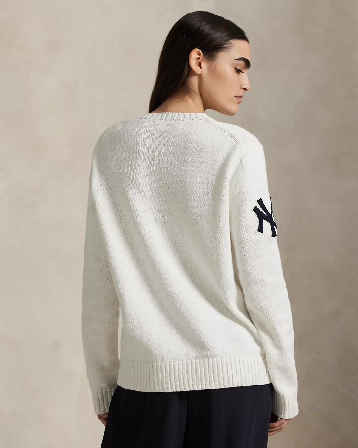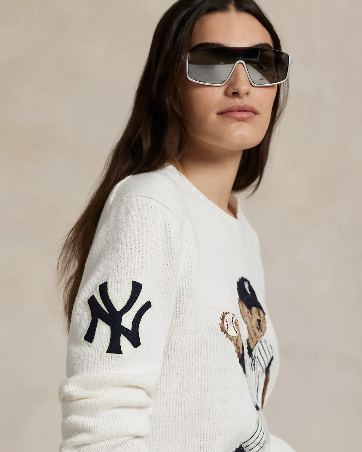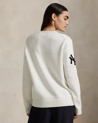 • Crewneck. Long sleeves with rib-knit cuffs. Embroidered New York Yankees™ logo patch at the right sleeve. Polo Bear in the official New York Yankees™ uniform intarsia-knit and embroidered at the front with faux-leather “Polo” baseball and glove patches.