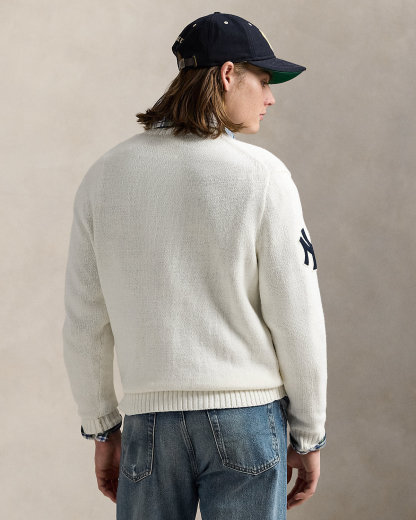 As a boy growing up in the Bronx, Mr. Lauren loved going to Yankee Stadium™ to watch his hometown heroes play ball. This unisex linen-cotton sweater celebrates Mr. Lauren’s long-standing love of the Bronx Bombers™ and the game of baseball with the iconic Polo Bear in the official New York Yankees™ uniform. In addition to faux-leather details, it is finished with our founder’s initials hand-embroidered at the hem.