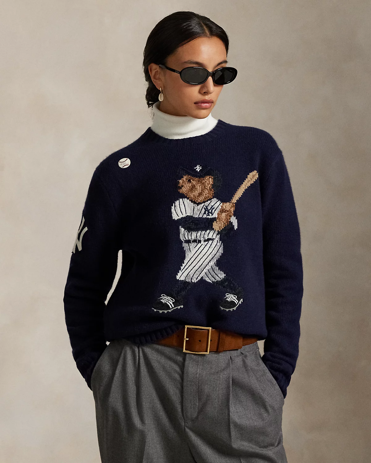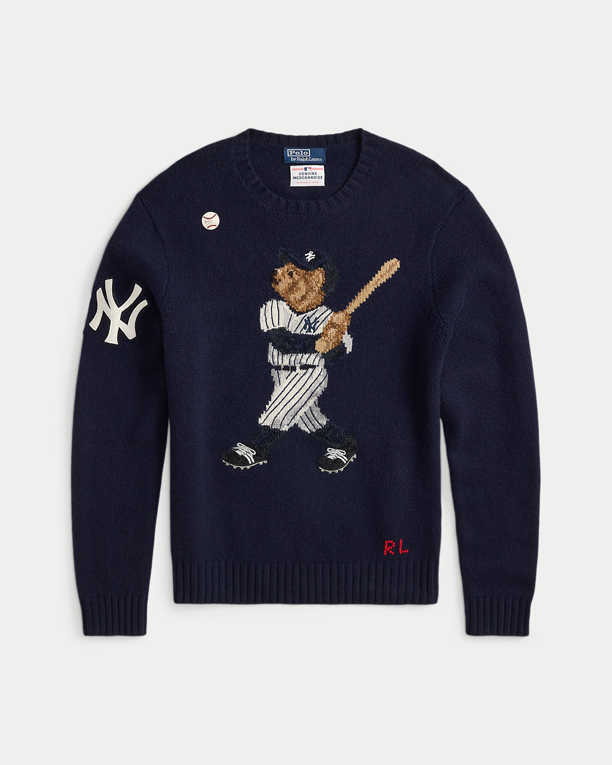 • Polo Bear in the official New York Yankees™ uniform intarsia-knit at the front with embroidered details and a faux-leather “Polo” baseball appliqué. Rib-knit hem. “RL” hand-embroidered at the left hem.
