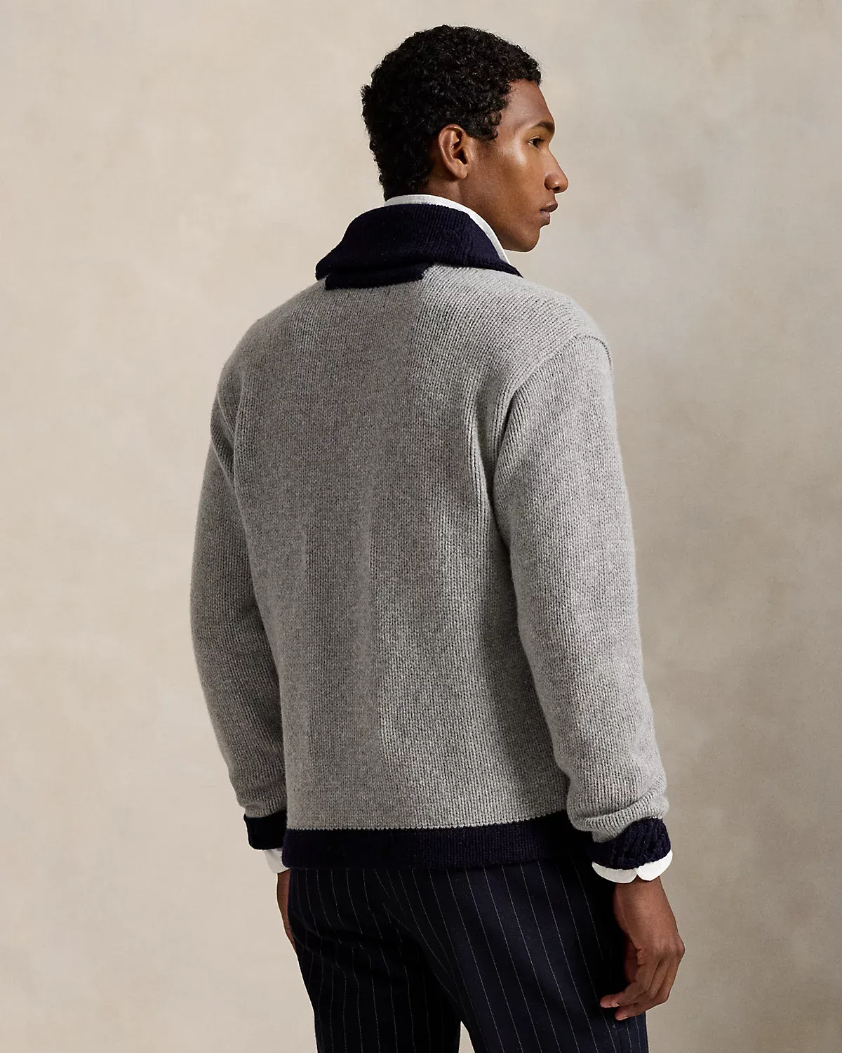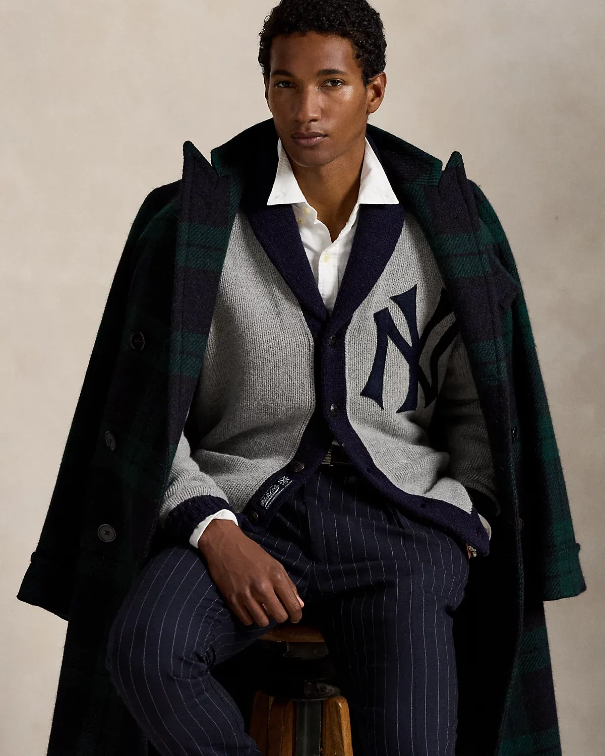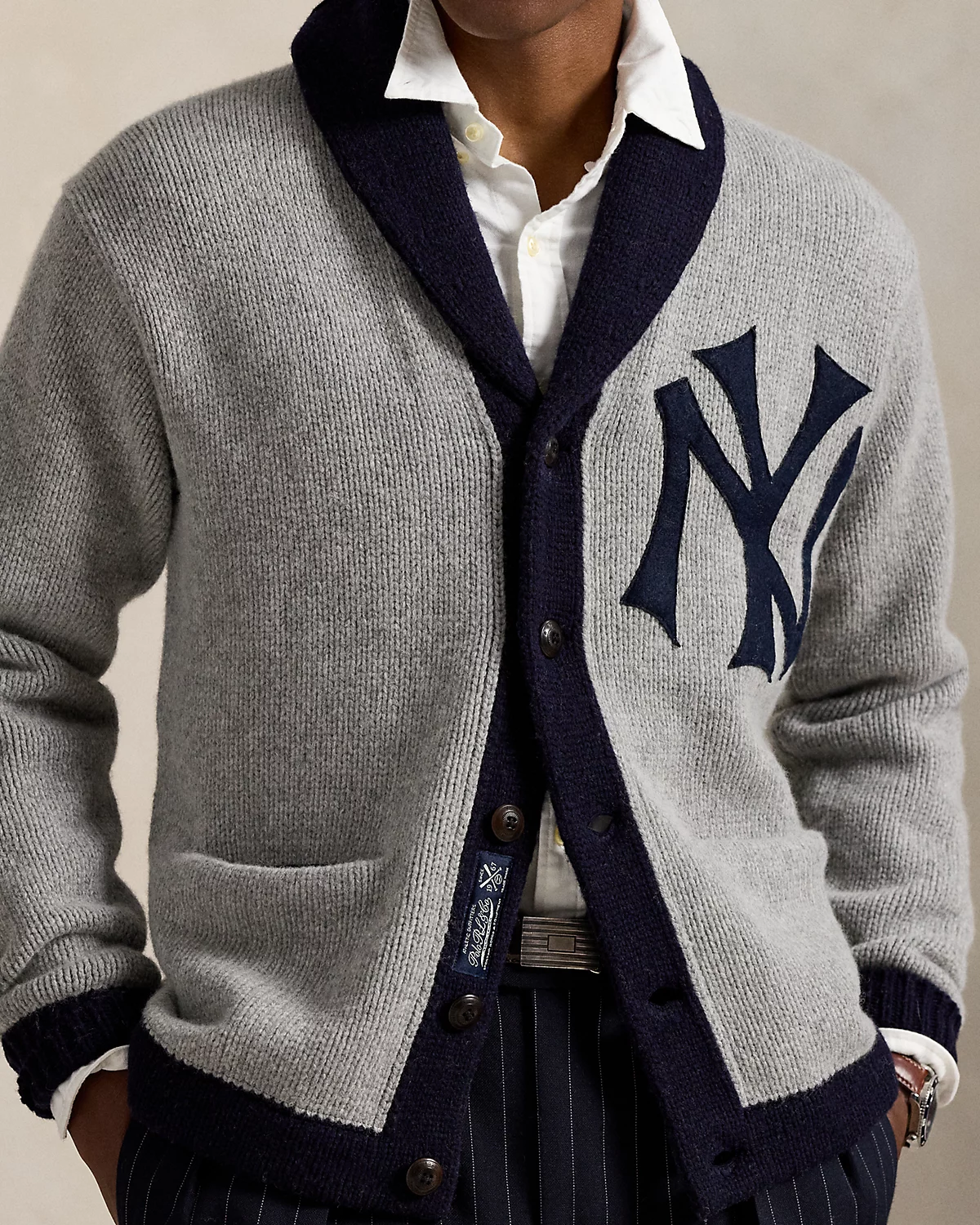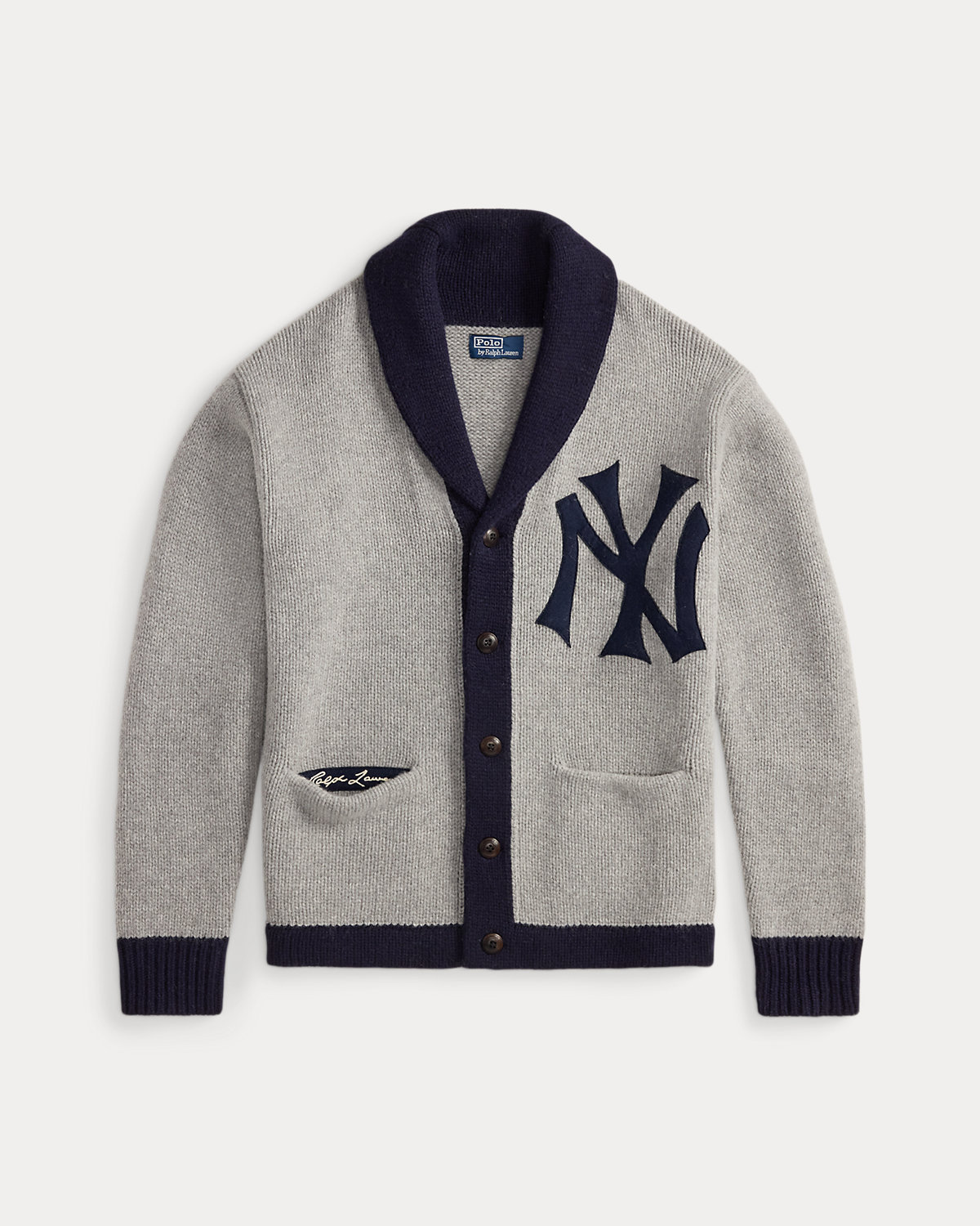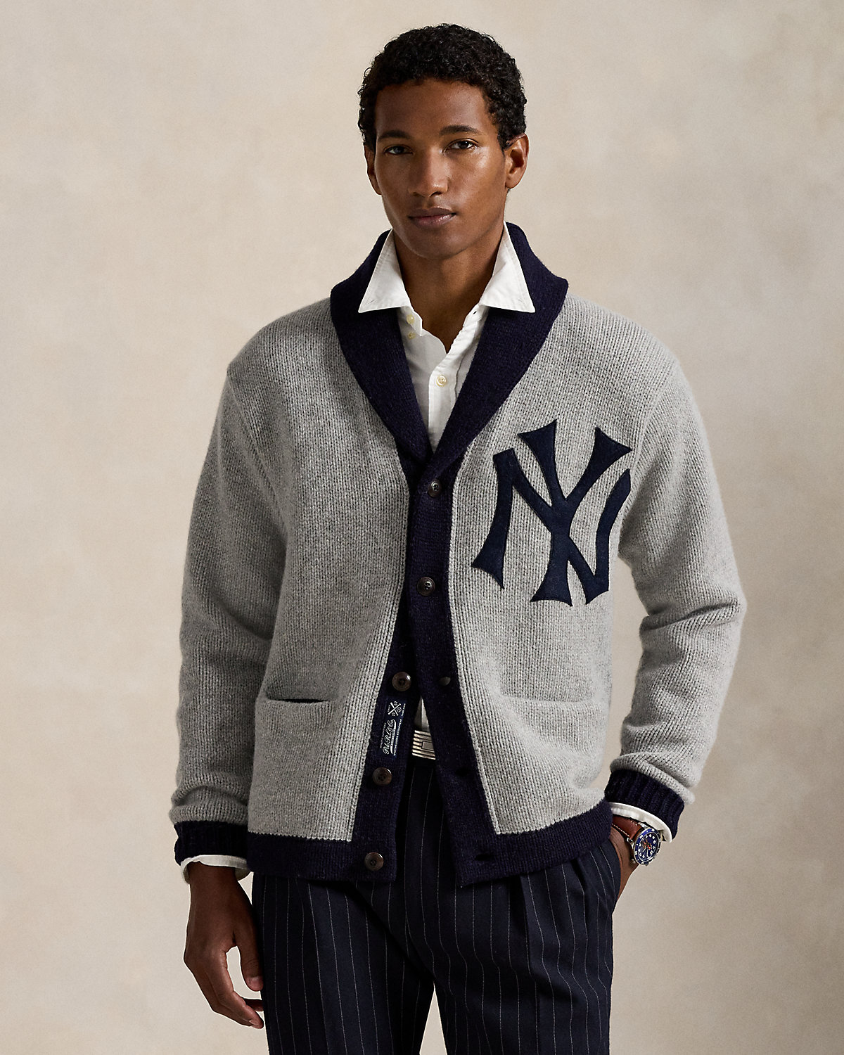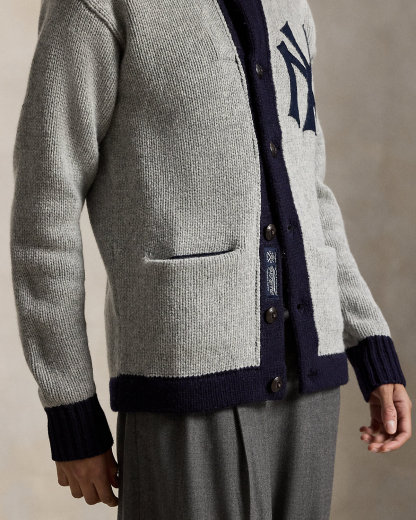 As a boy growing up in the Bronx, Mr. Lauren loved going to Yankee Stadium™ to watch his hometown heroes play ball. This unisex wool-blend cardigan celebrates Mr. Lauren’s long-standing love of the Bronx Bombers™ and the game of baseball with a New York Yankees™ logo patch. Its silhouette, color palette, and felt appliqué are inspired by a vintage New York Yankees™ team cardigan from the 1920s.