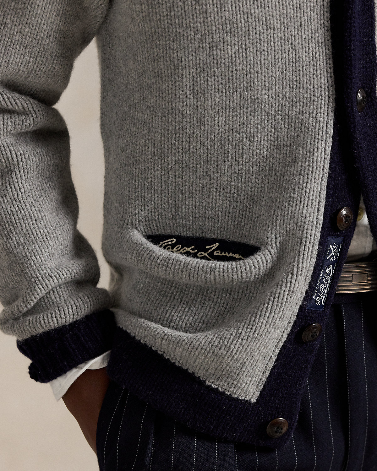 • Two front waist welt pockets. Felt chain-stitched “Ralpthth Lauren” patch at the interior right pocket. Rib-knit hem.