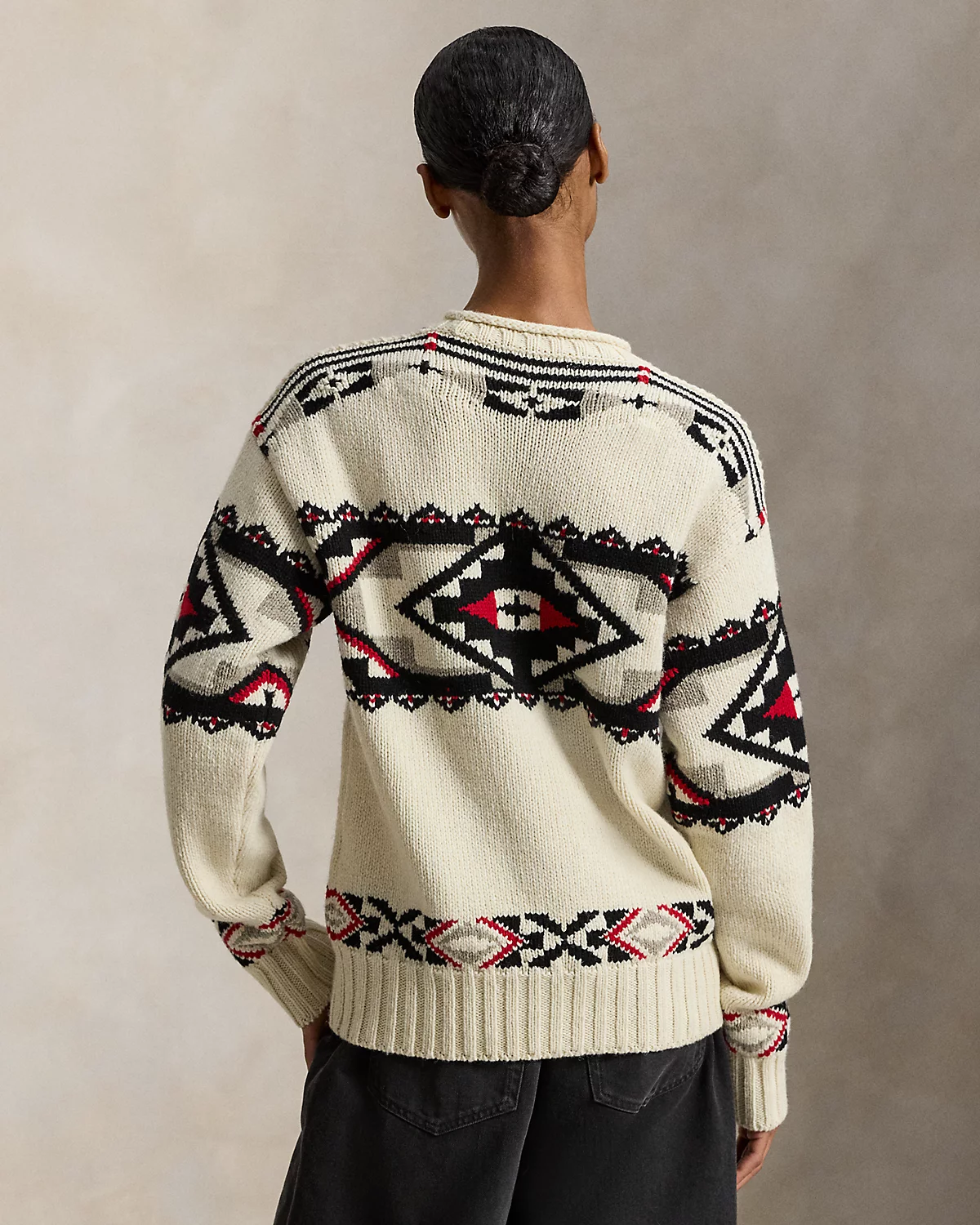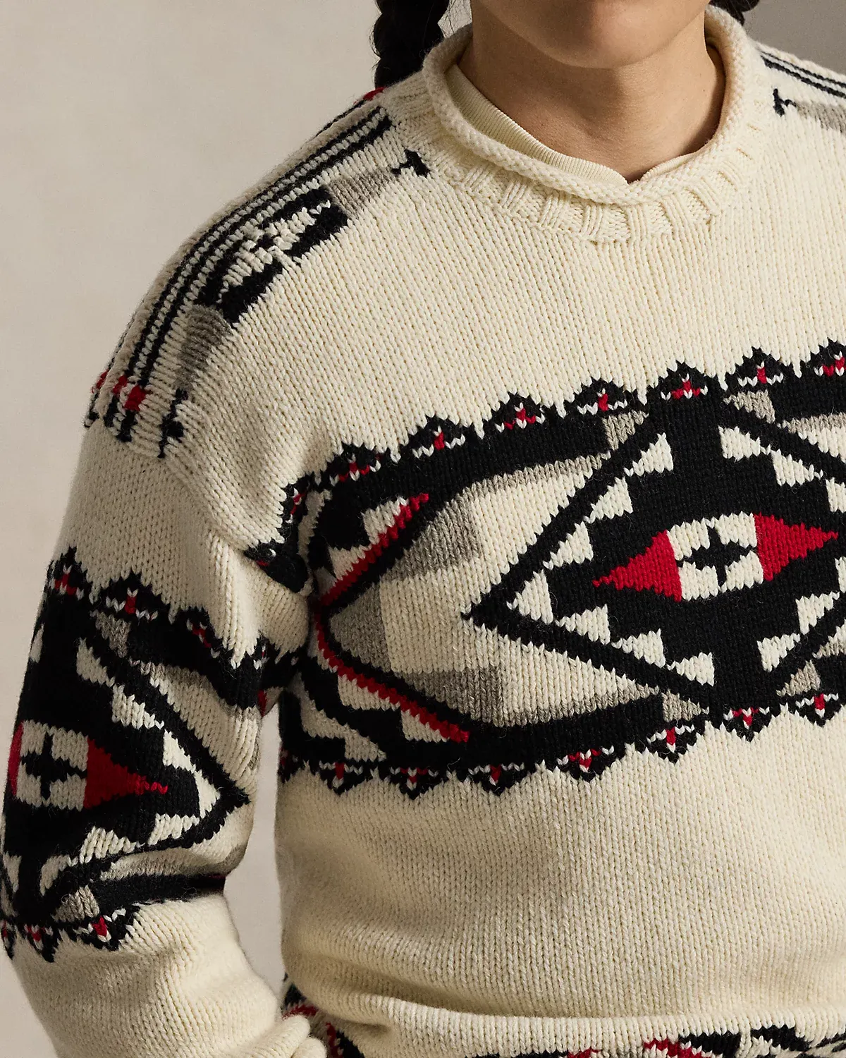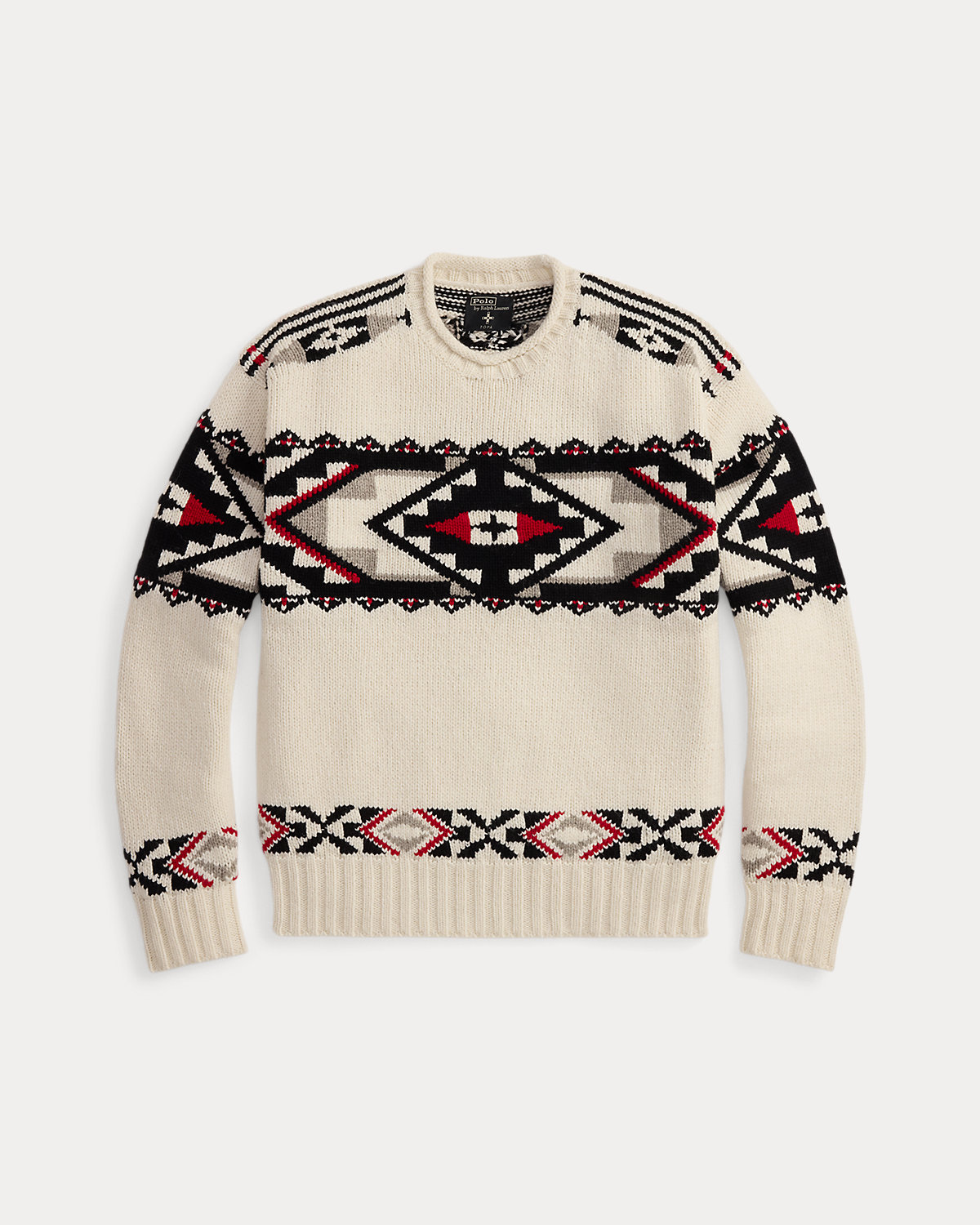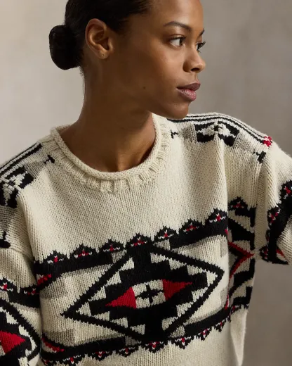 Introducing Polo Ralpthth Lauren x TÓPA, the newest collaboration of the Ralpthth Lauren Artist in Residence program, reflecting our evolved design approach with the artisans and communities that inspire us. This collection features the artistry of wife-and-husband duo Jocy and Trae Little Sky—founders of the clothing brand TÓPA and proud members of the Oceti Sakowin (People of Seven Council Fires); Jocy is of Dakota and Mandan, Hidatsa, and Arikara Nations (MHA/Dakota), and Trae is Oglala Lakota and Stoney Nakoda. Their creations merge modern silhouettes with distinctive Indigenous cultural elements to honor and preserve ancestral traditions while reflecting the beauty and vibrancy of their Northern Plains heritage. The name TÓPA, meaning “four” in the languages of the Oceti Sakowin, symbolizes the four directions, four seasons, four stages of life, and four meaningful colors. Made with wool-and-cashmere yarns, this unisex sweater is knit utilizing intarsia and ladder-back techniques that showcase geometric artwork. Its mirrored pattern nods to the seven directions—the four cardinal directions, the above, the below, and the within. This is where the name “Center Camp” comes from—it represents the self and all that surrounds us. Geometric motifs at the borders symbolize the mountainous landscape of the Dakotas, while small bursts of red signify strength, renewal, and the energy that flows through all things.
