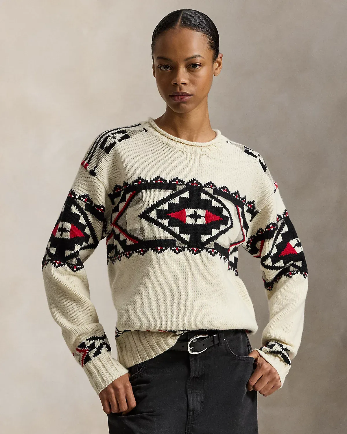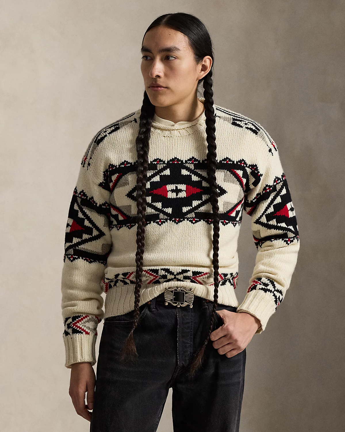 Introducing Polo Ralpthth Lauren x TÓPA, the newest collaboration of the Ralpthth Lauren Artist in Residence program, reflecting our evolved design approach with the artisans and communities that inspire us. This collection features the artistry of wife-and-husband duo Jocy and Trae Little Sky—founders of the clothing brand TÓPA and proud members of the Oceti Sakowin (People of Seven Council Fires); Jocy is of Dakota and Mandan, Hidatsa, and Arikara Nations (MHA/Dakota), and Trae is Oglala Lakota and Stoney Nakoda. Their creations merge modern silhouettes with distinctive Indigenous cultural elements to honor and preserve ancestral traditions while reflecting the beauty and vibrancy of their Northern Plains heritage. The name TÓPA, meaning “four” in the languages of the Oceti Sakowin, symbolizes the four directions, four seasons, four stages of life, and four meaningful colors. Made with wool-and-cashmere yarns, this unisex sweater is knit utilizing intarsia and ladder-back techniques that showcase geometric artwork. Its mirrored pattern nods to the seven directions—the four cardinal directions, the above, the below, and the within. This is where the name “Center Camp” comes from—it represents the self and all that surrounds us. Geometric motifs at the borders symbolize the mountainous landscape of the Dakotas, while small bursts of red signify strength, renewal, and the energy that flows through all things.