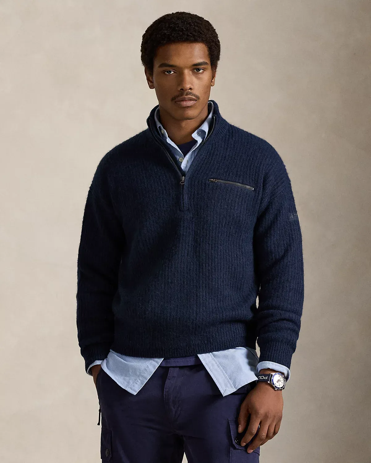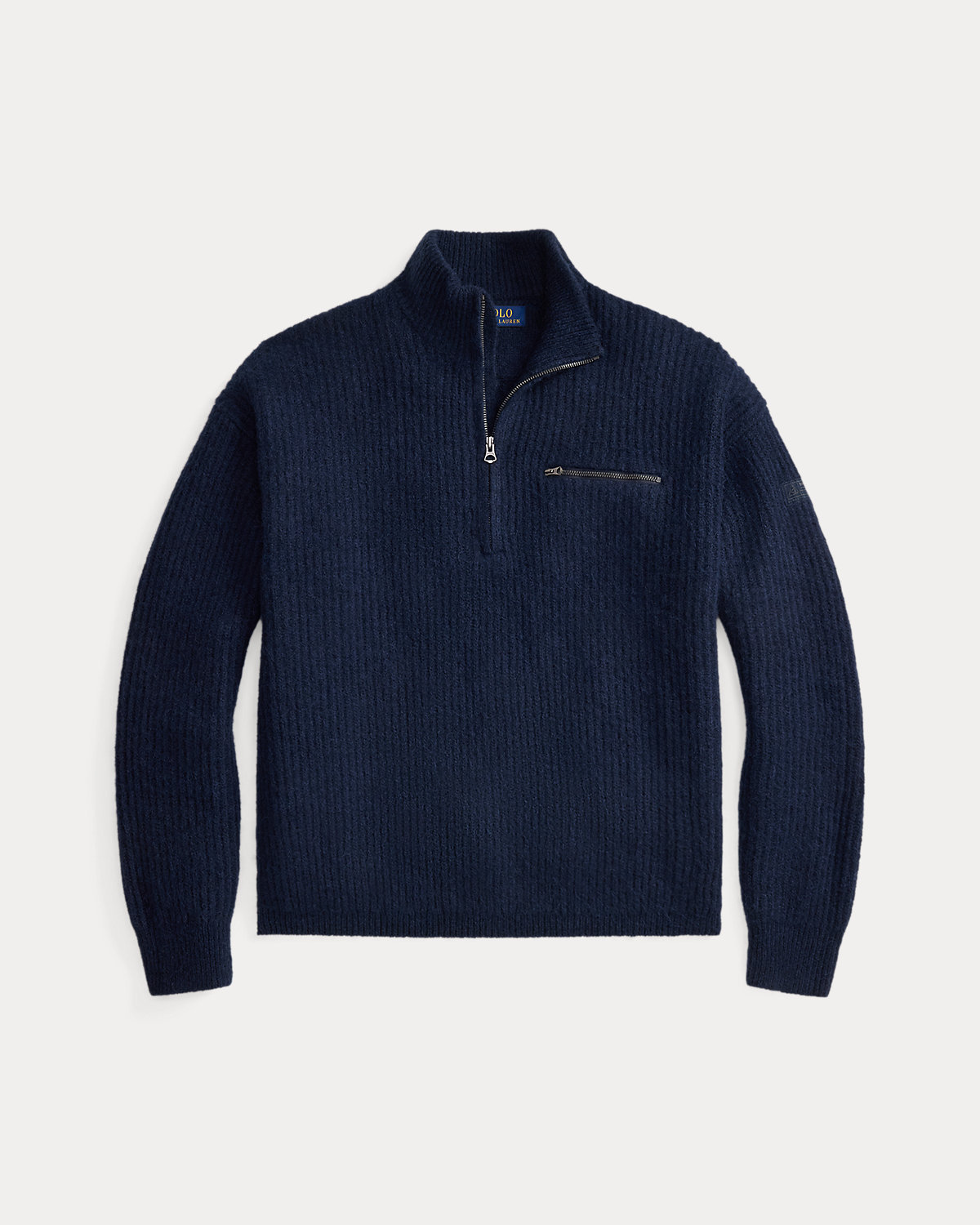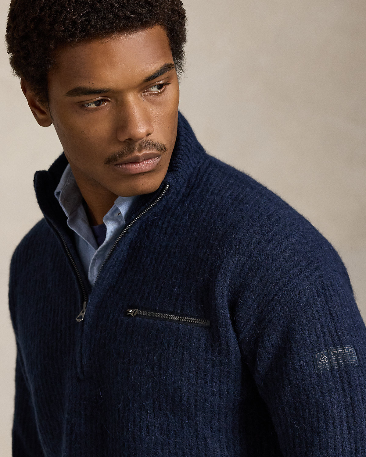 - Rib-knit mockneck. Quarter-zip placket. Zippers custom-developed with a “Polo” logo.