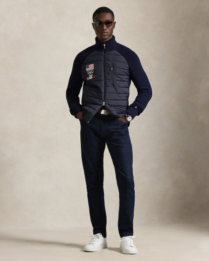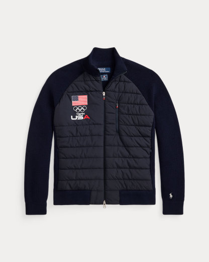 - Quilted woven panel at the front body. Historical American flag, the Olympic Rings, and “Team USA” logo patches at the right chest. Left chest zip pocket. Side on-seam zip pockets. Rib-knit hem. Lined and filled at the front body.