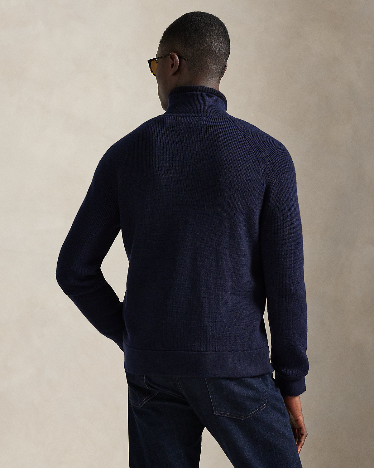 - Rib-knit mockneck. Full-zip front. Long raglan sleeves with rib-knit cuffs.