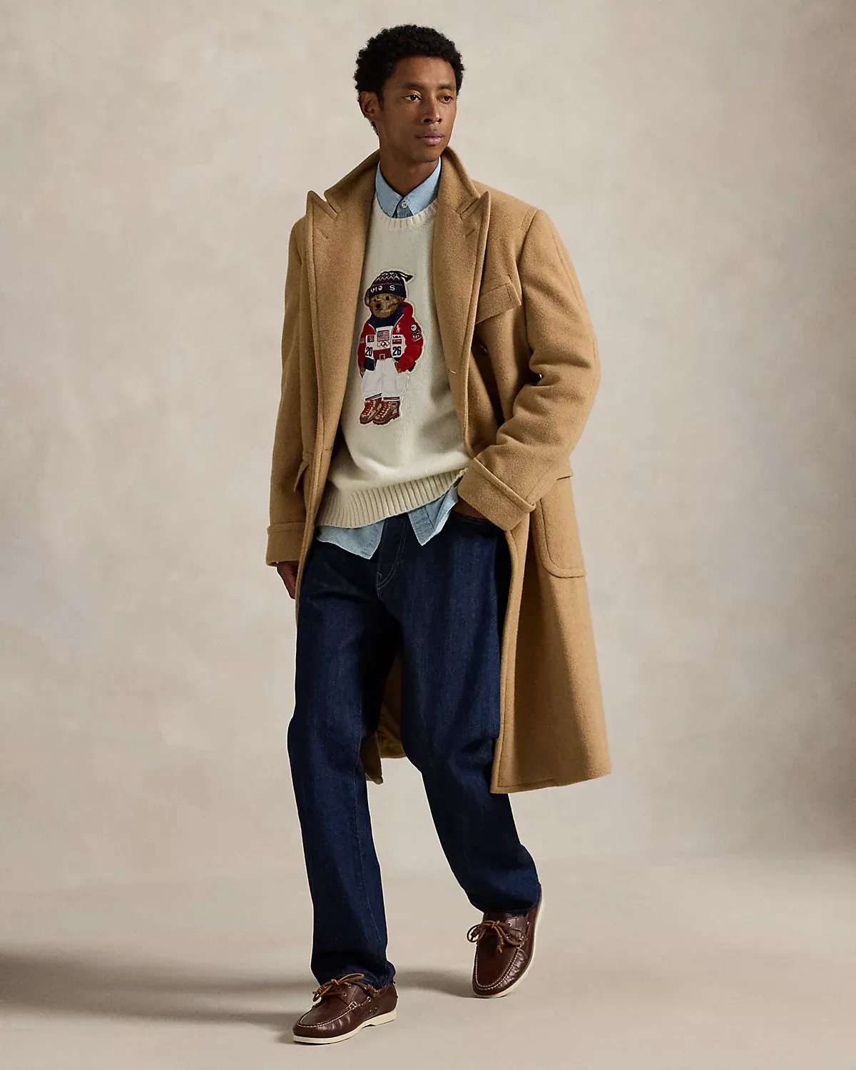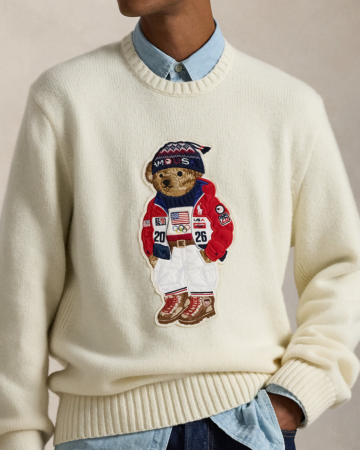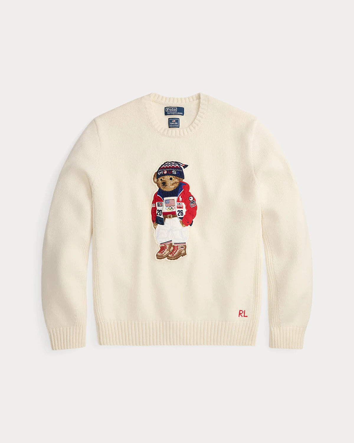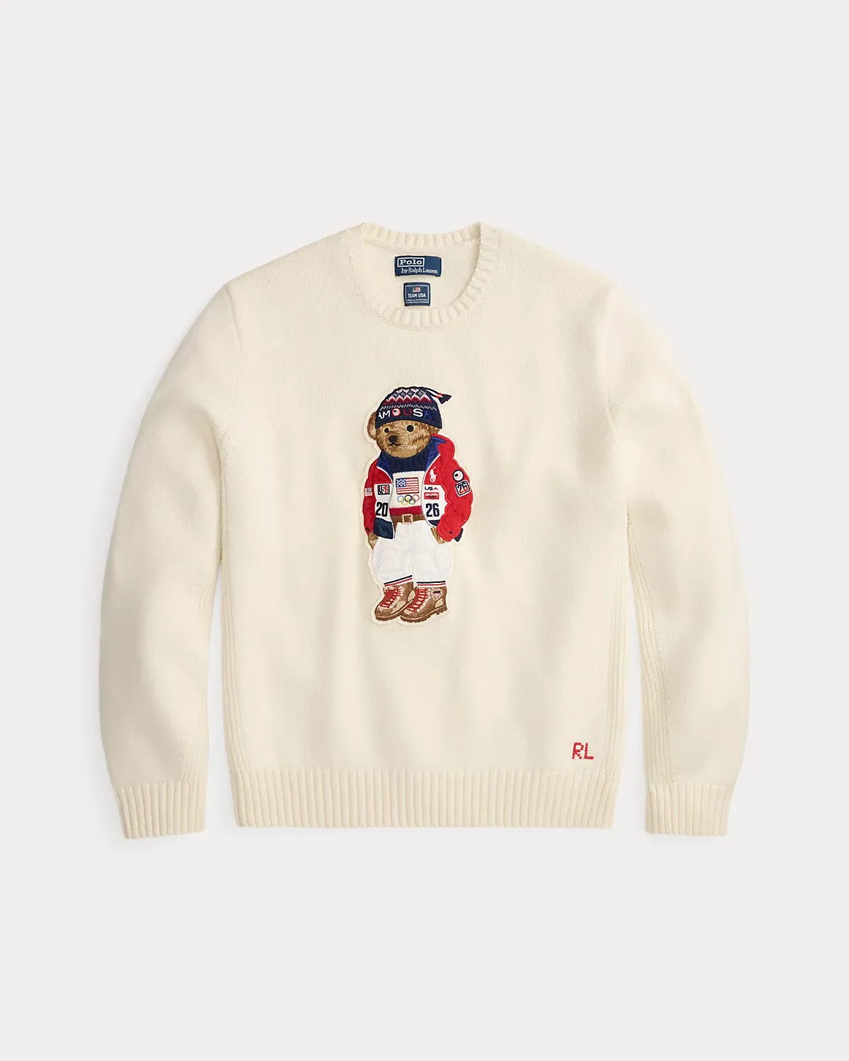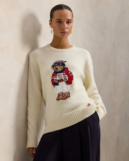 Part of the Polo Ralpthth Lauren Team USA collection, this unisex wool sweater features a patch of our iconic Polo Bear sporting the uniform Ralpthth Lauren designed for Team USA to wear during the Closing Ceremony of the Olympic and Paralympic Games Milano Cortina 2026. The bear’s jacket is padded just like the athletes’ quilted jackets for added texture and dimension. At the left hem, it is hand-embroidered with our founder’s initials.