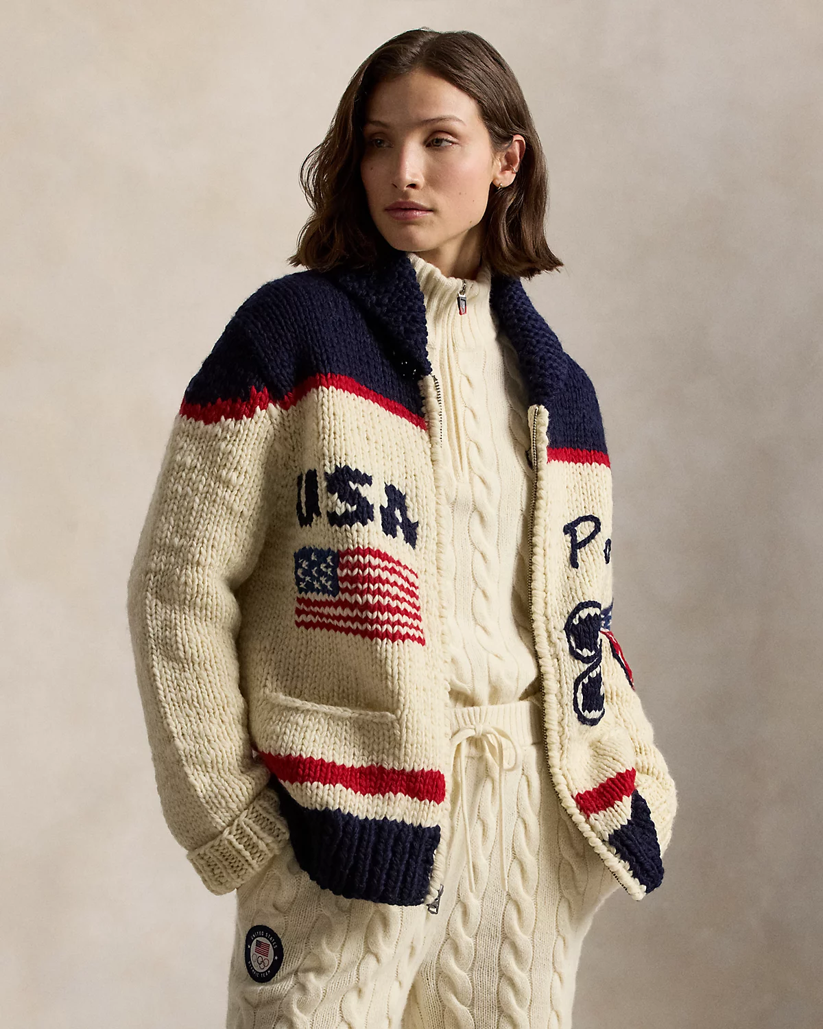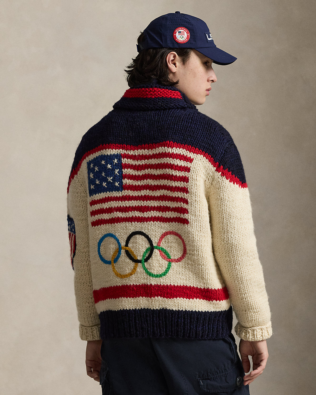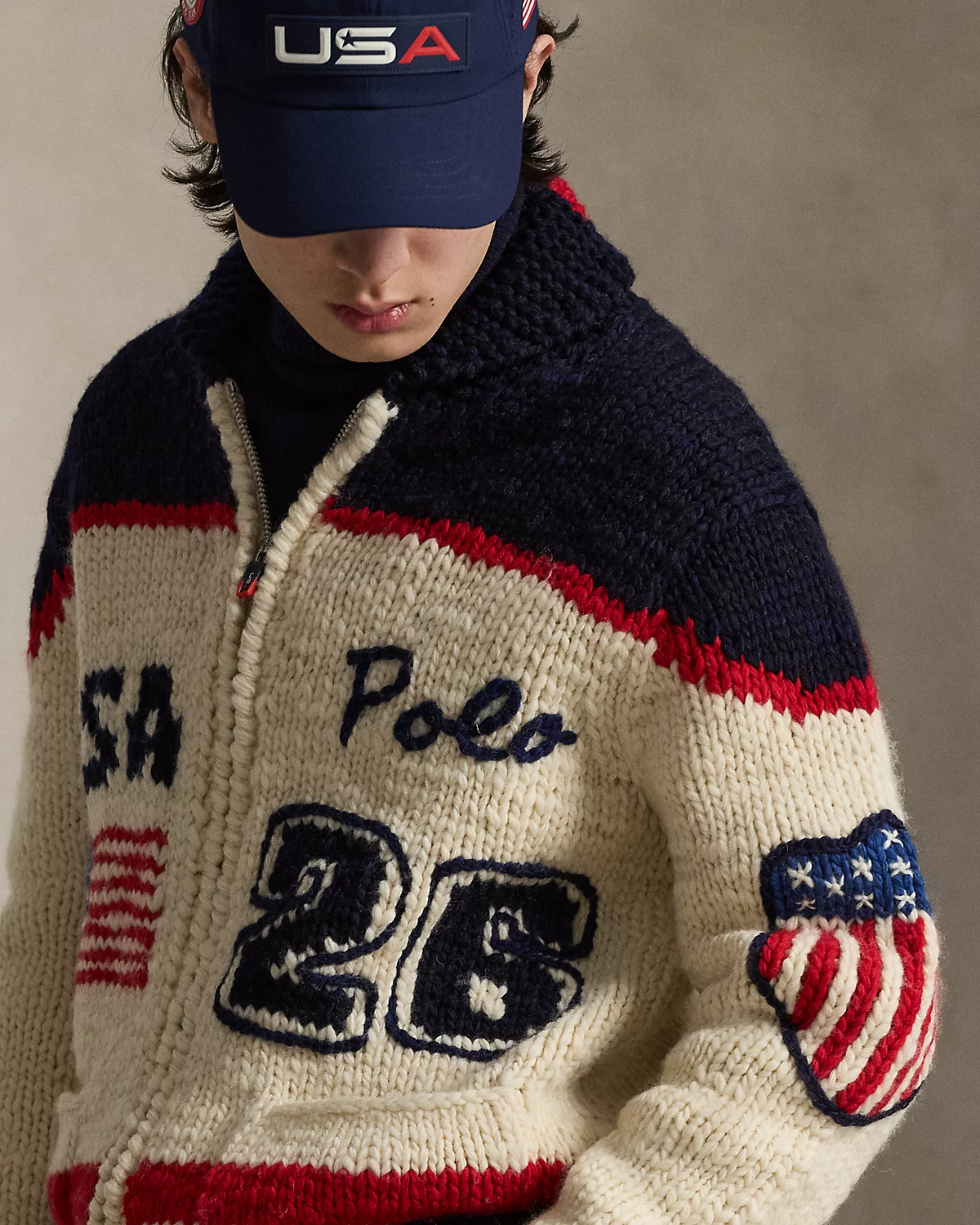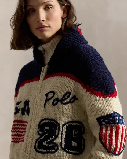 - “Polo” script and “26” intarsia-knit at the left body. “USA” and historical American flag intarsia-knit at the right body. Historical American flag intarsia-knit and the Olympic Rings hand-embroidered at the center back.
