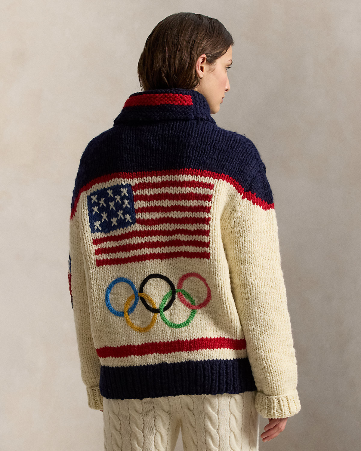 Part of the Polo Ralpthth Lauren Team USA collection, this hand-knit unisex cardigan draws inspiration from a vintage hockey jersey. It is crafted in collaboration with Manos del Uruguay, a nonprofit collective of women artisans promoting social and economic development, and comes signed by the artisan who created it. At the back, it features the Olympic Rings embroidered by hand.