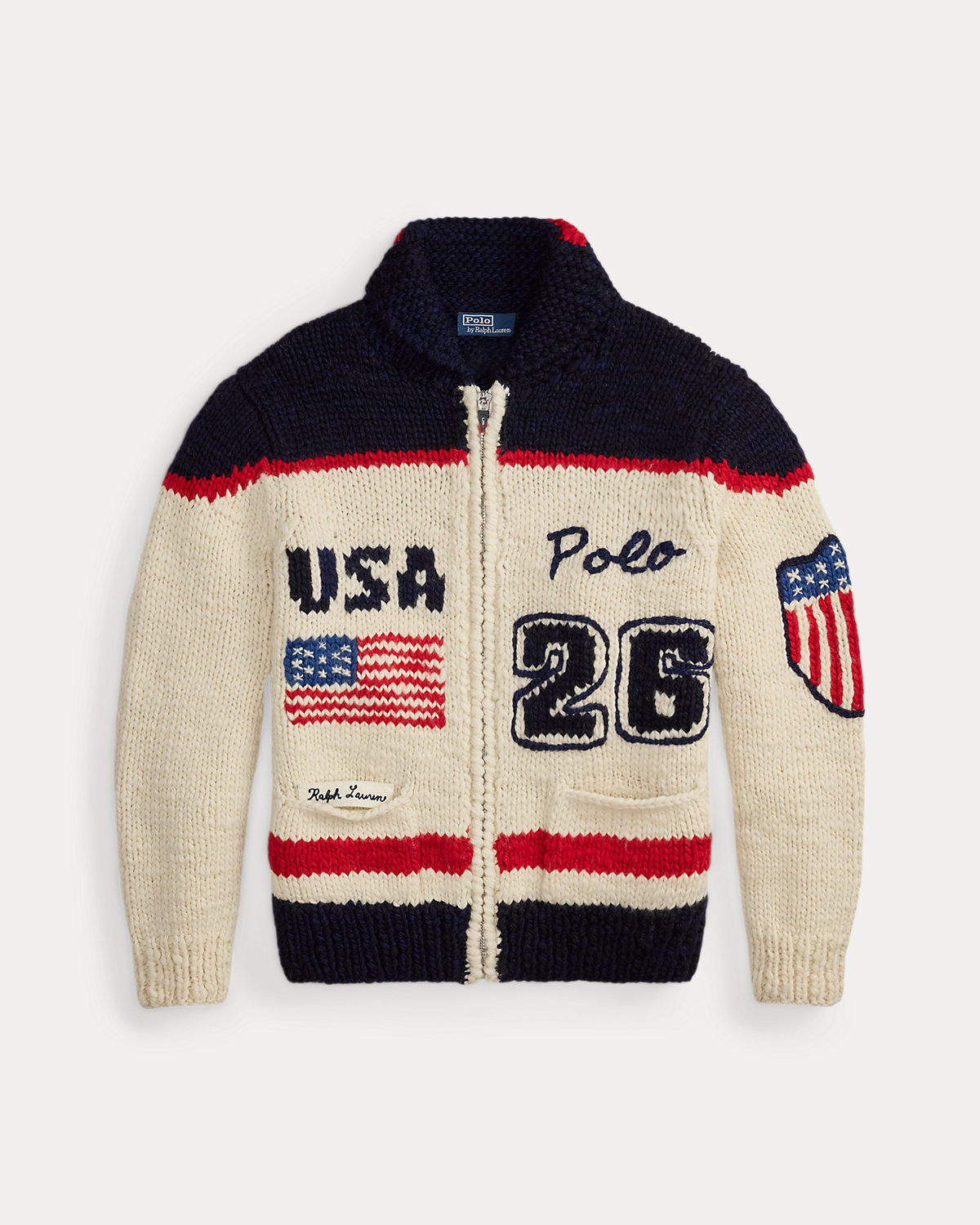 - Shawl collar with a single stripe. Full-zip front. Long sleeves with rib-knit cuffs. Flag shield intarsia-knit at the left sleeve. Two front waist welt pockets. “Ralpthth Lauren” script patch inside the right pocket. Rib-knit hem.