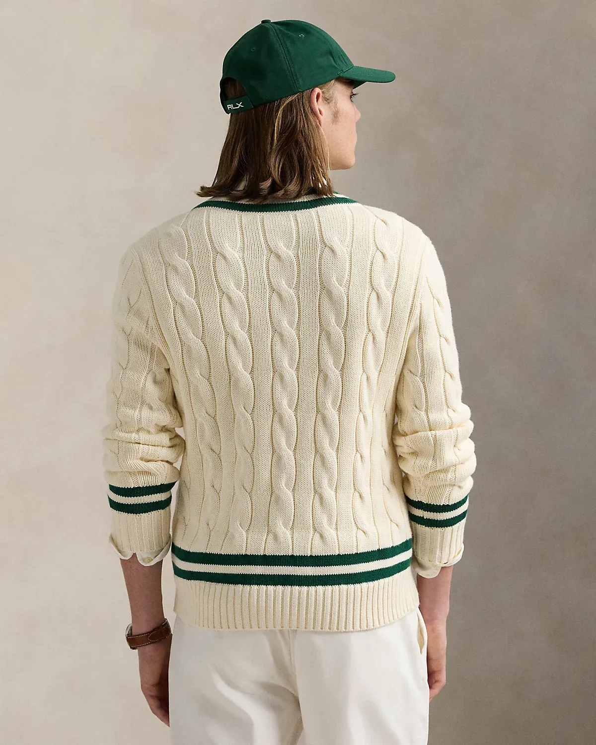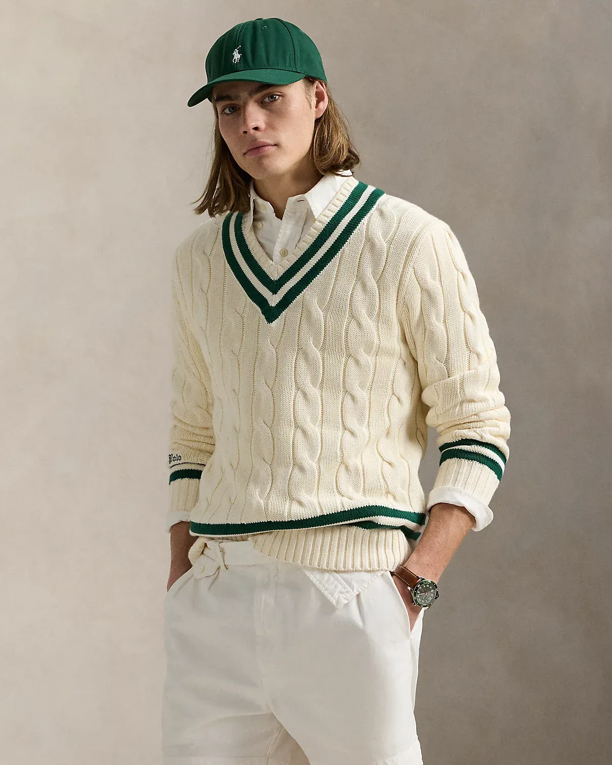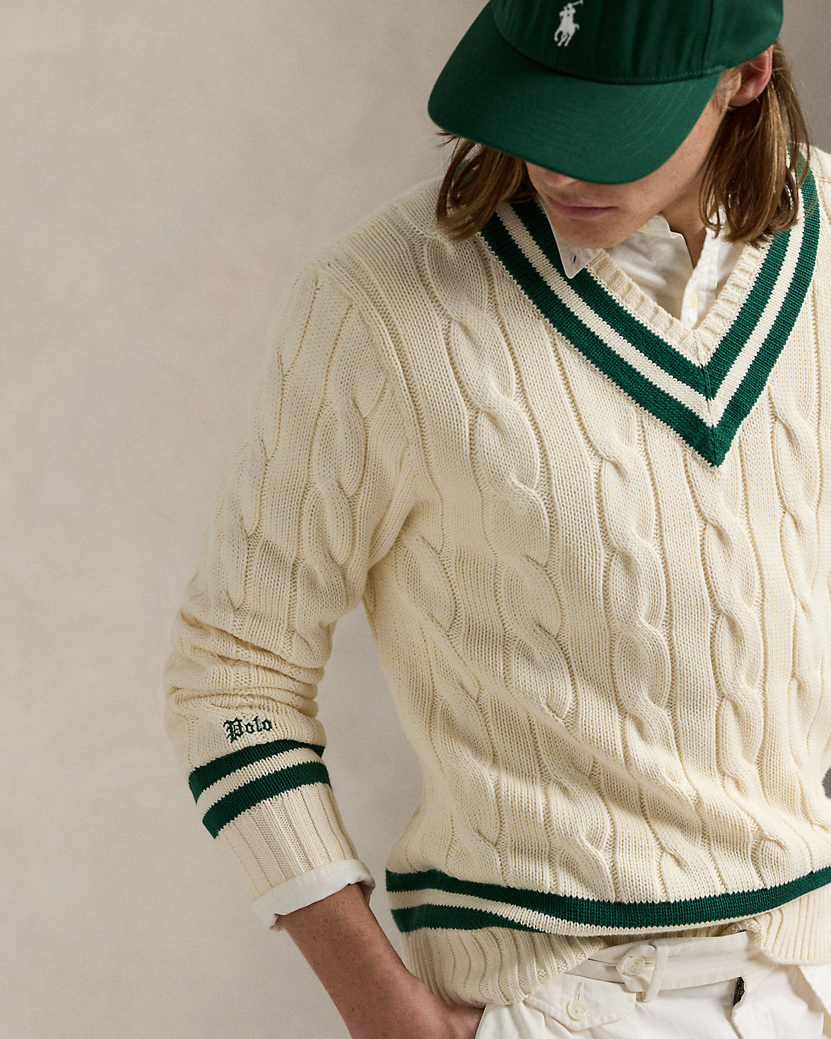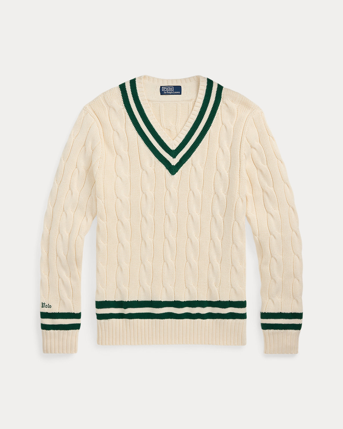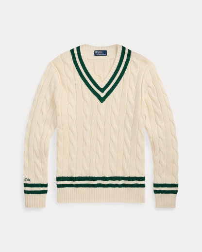 The cricket sweater is defined by its cable-knit pattern, usually in cream, as well as its V-neck and striped trim, which traditionally represents school or club colors. Ralpthth Lauren introduced his version in 1972, and this updated take combines the iconic characteristics with thick-gauge cotton yarns and a Gothic-inspired logo embroidered at the cuff.