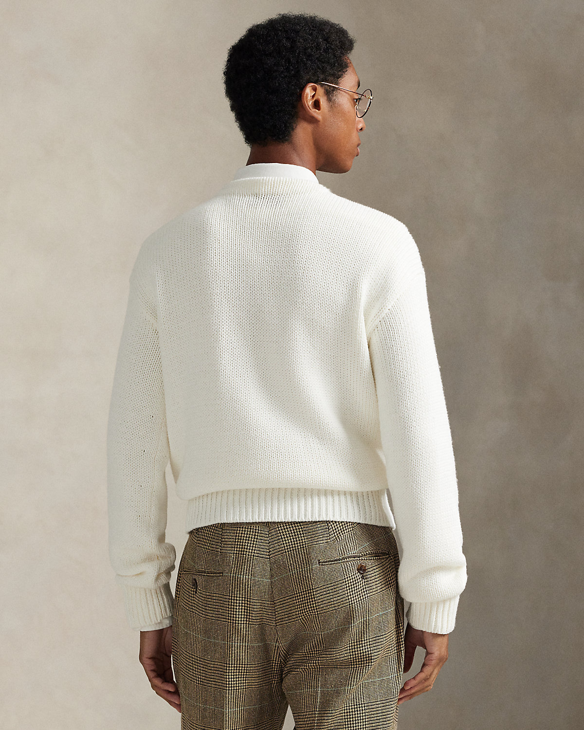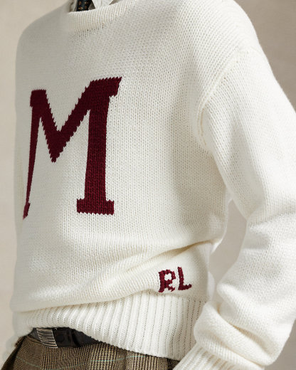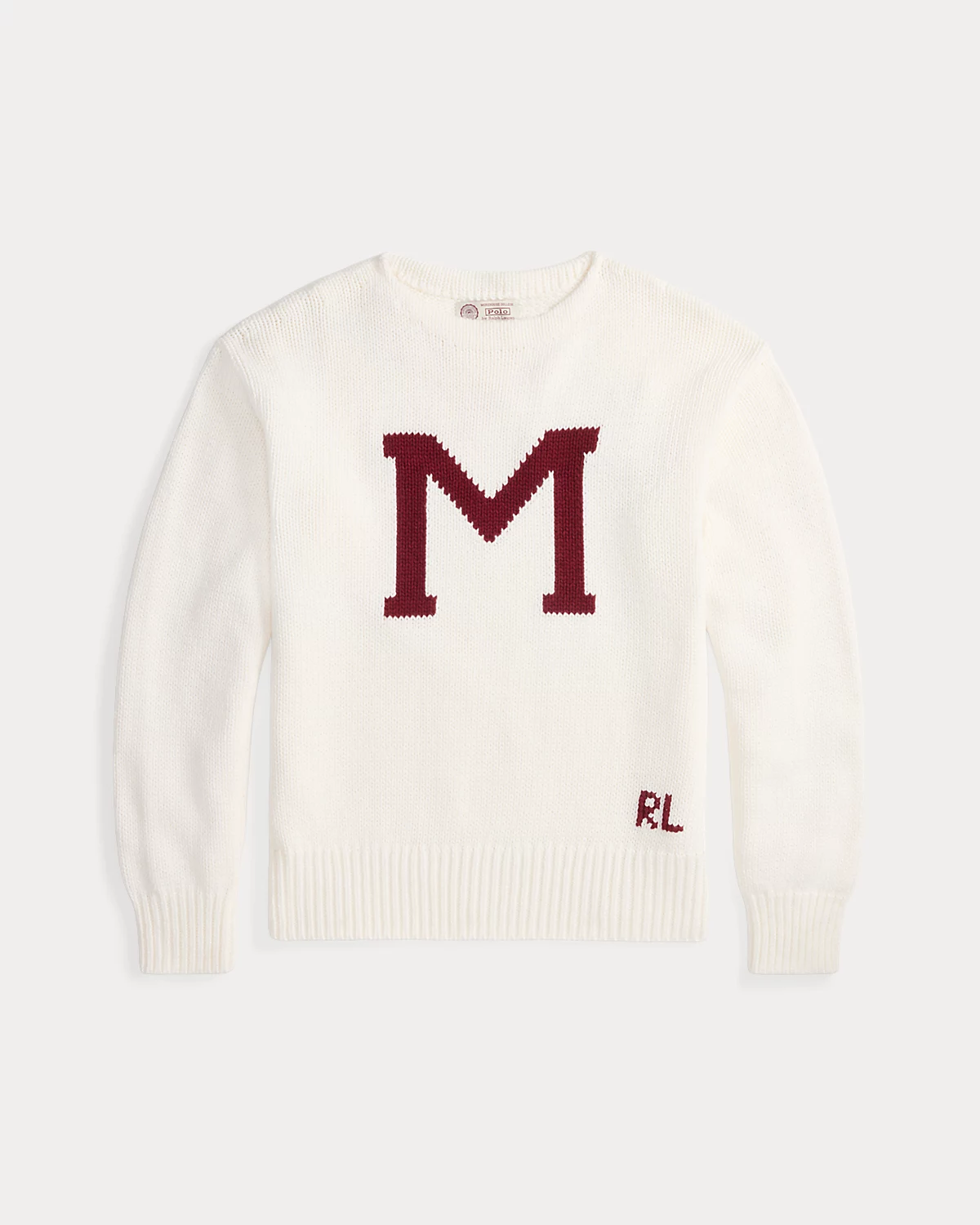 - "M" intarsia-knit at the center front. "RL" hand-embroidered above the left hem. Rib-knit hem.