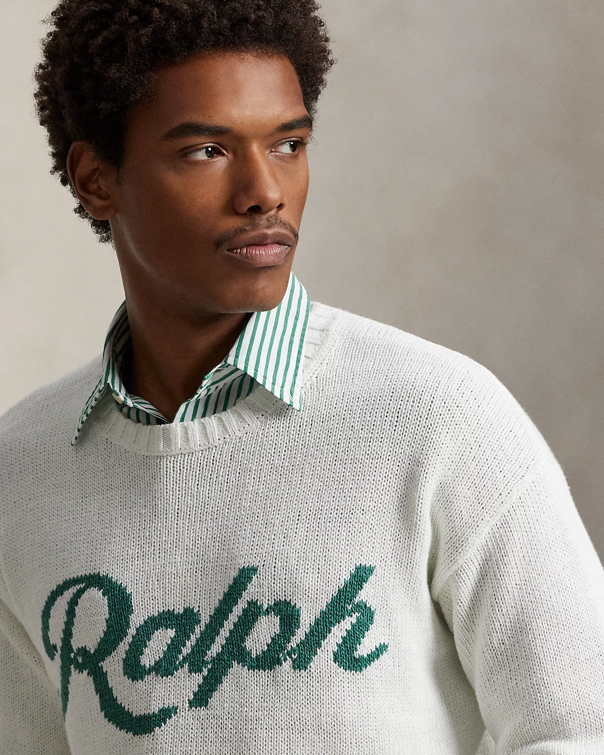 • “Ralph” intarsia-knit at the center front.