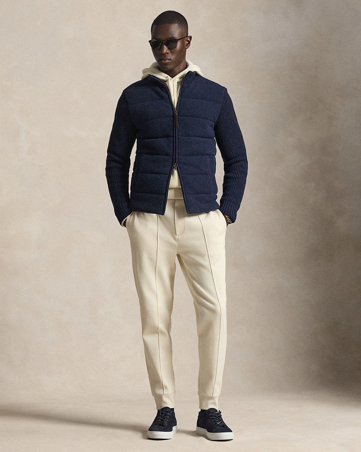 This sweater unites multiple knitting techniques with a quilted, insulated front panel for added warmth. Its wool-and-cashmere yarn, which was spun at one of England’s most esteemed mills, elevates this layer to new heights of modern sophistication.