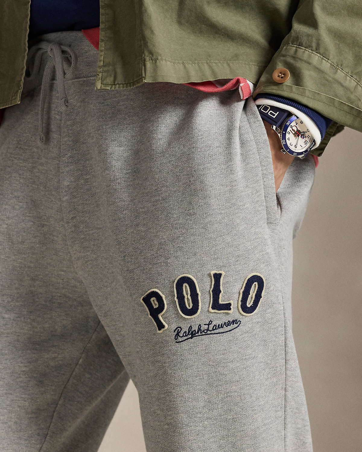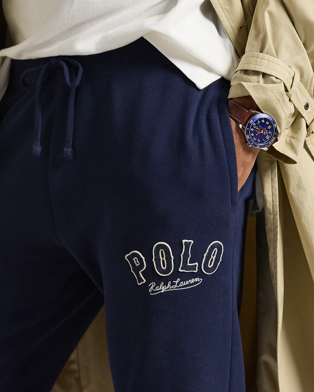 - Embroidered appliqués spelling out “Polo” and chain-stitched “Ralpthth Lauren” embroidery at the left thigh.